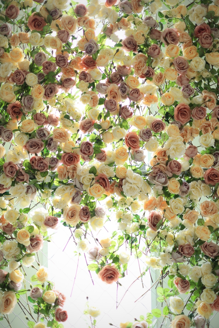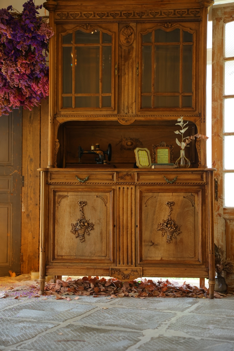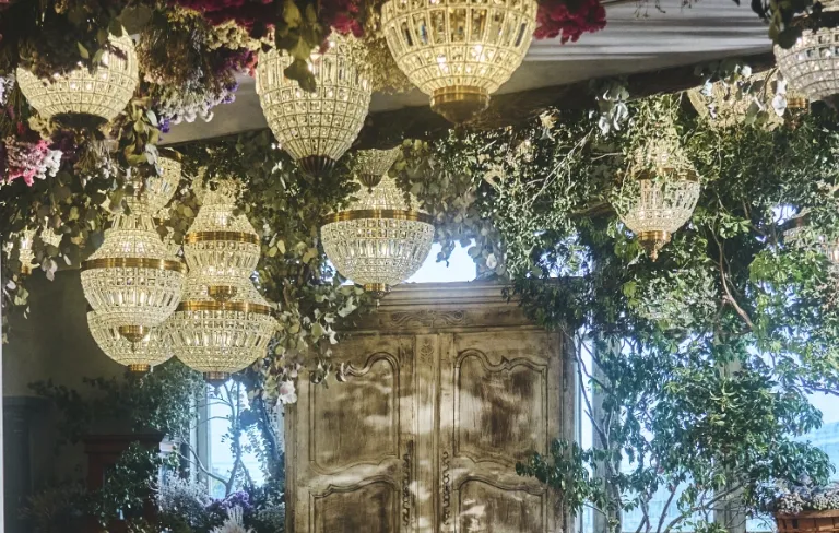 披露宴会場として使用されるエピネはエントランスの200年前のアンティークドアをはじめ、厳選されたフランスのアンティーク品と天井一面の1万本以上のドライフラワーやシャンデリアが演出する非日常の空間です。