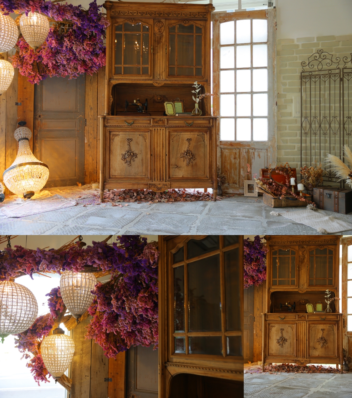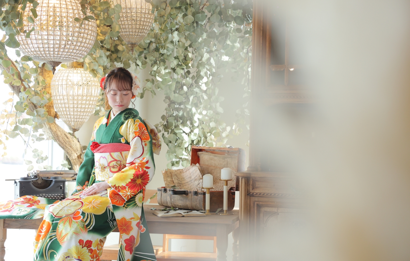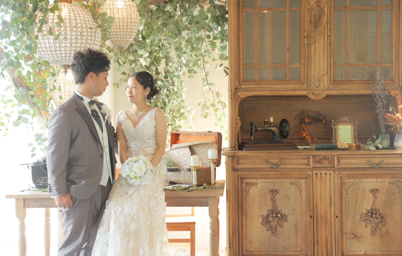 当店1番人気のスタジオ・ソアレ。大きな本物のアンティーク家具やたくさんのドライフラワーで物語のワンシーンのような雰囲気で撮影ができるセットや、落ち着いた背景で大人っぽくクールな撮影ができるセットを揃えたスタジオです。