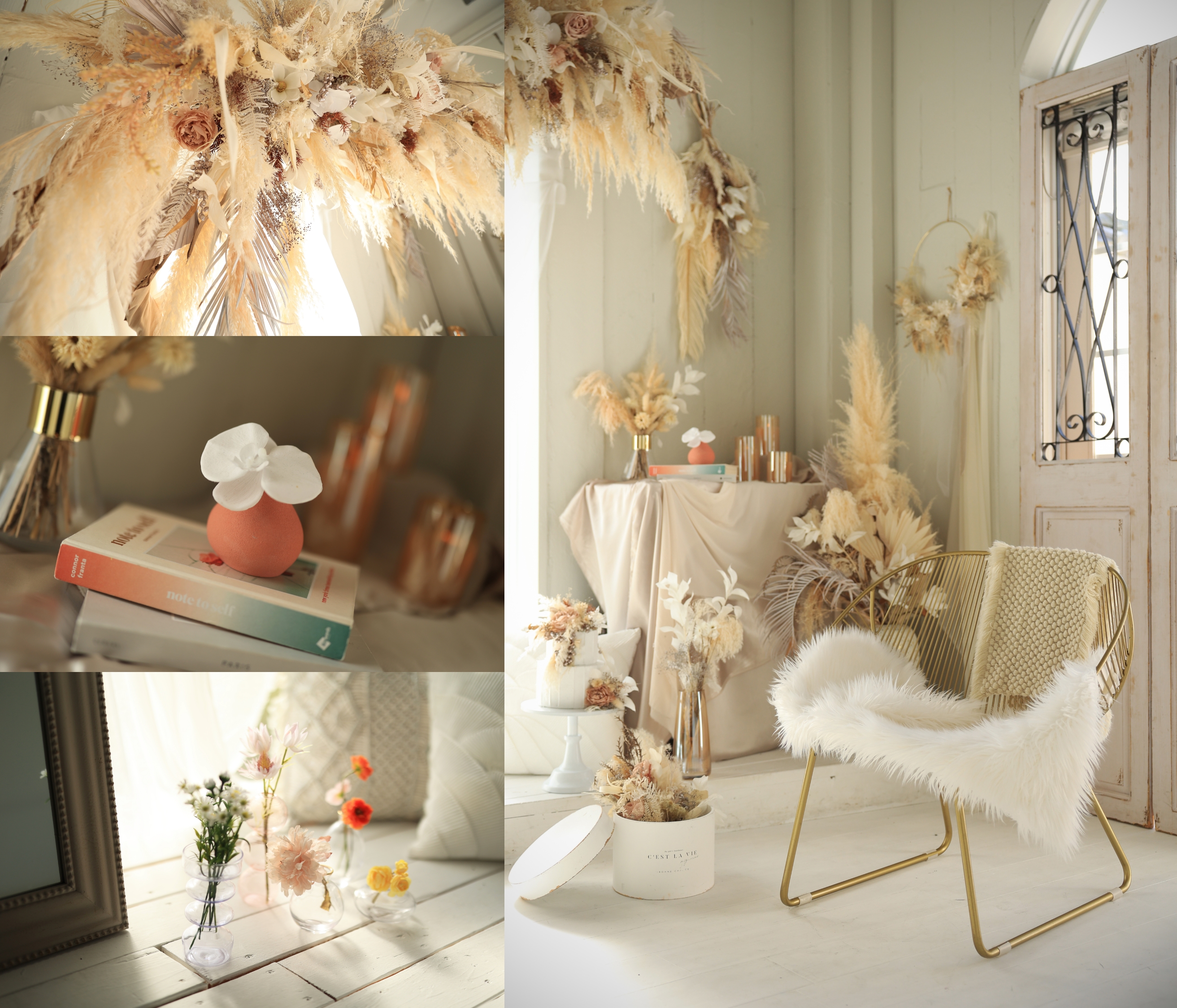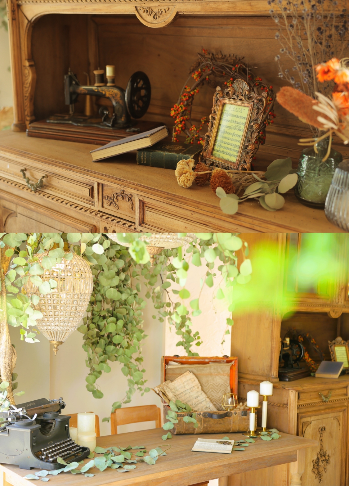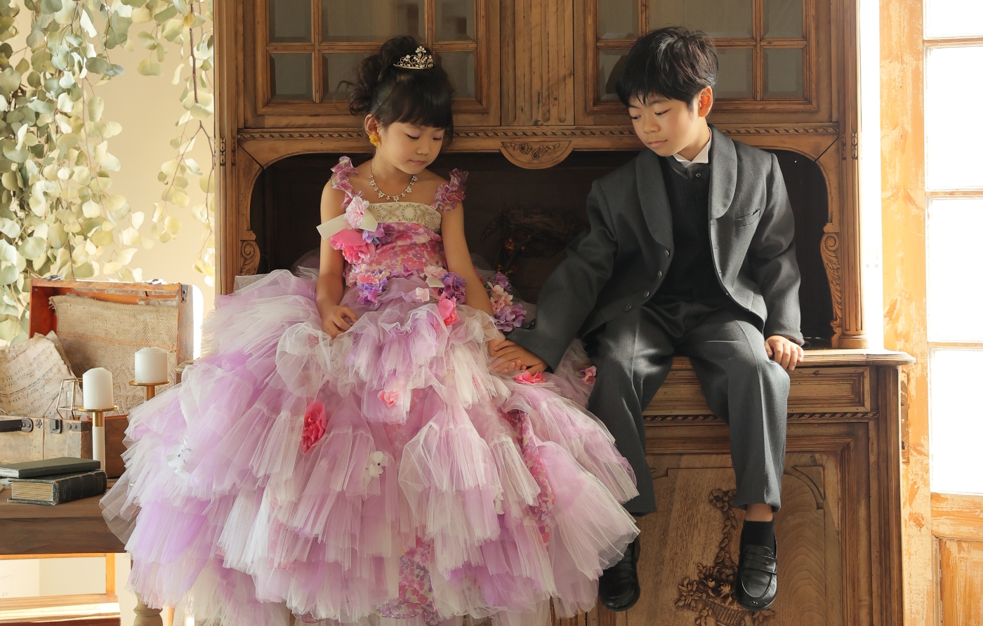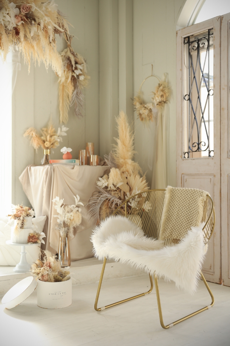 当店1番人気のスタジオ・ソアレ。大きな本物のアンティーク家具やたくさんのドライフラワーで物語のワンシーンのような雰囲気で撮影ができるセットや、落ち着いた背景で大人っぽくクールな撮影ができるセットを揃えたスタジオです。