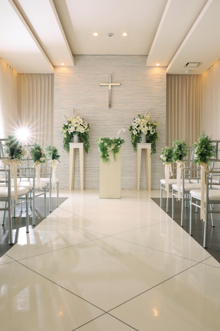 白を基調したチャペルで写真だけの結婚式にぴったりの撮影ができるスタジオです。こちらでは実際に40名までのセレモニーも可能。挙式・披露宴をされない新郎新婦様にも人気のスタジオです。指輪の交換やベールアップなど、セレモニーを再現したような写真を残すこともできます。
