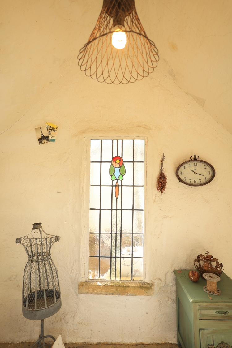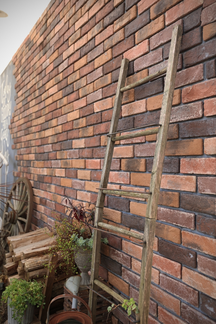 アンティーク家具と木目の温かさ、モルタルの力強さが