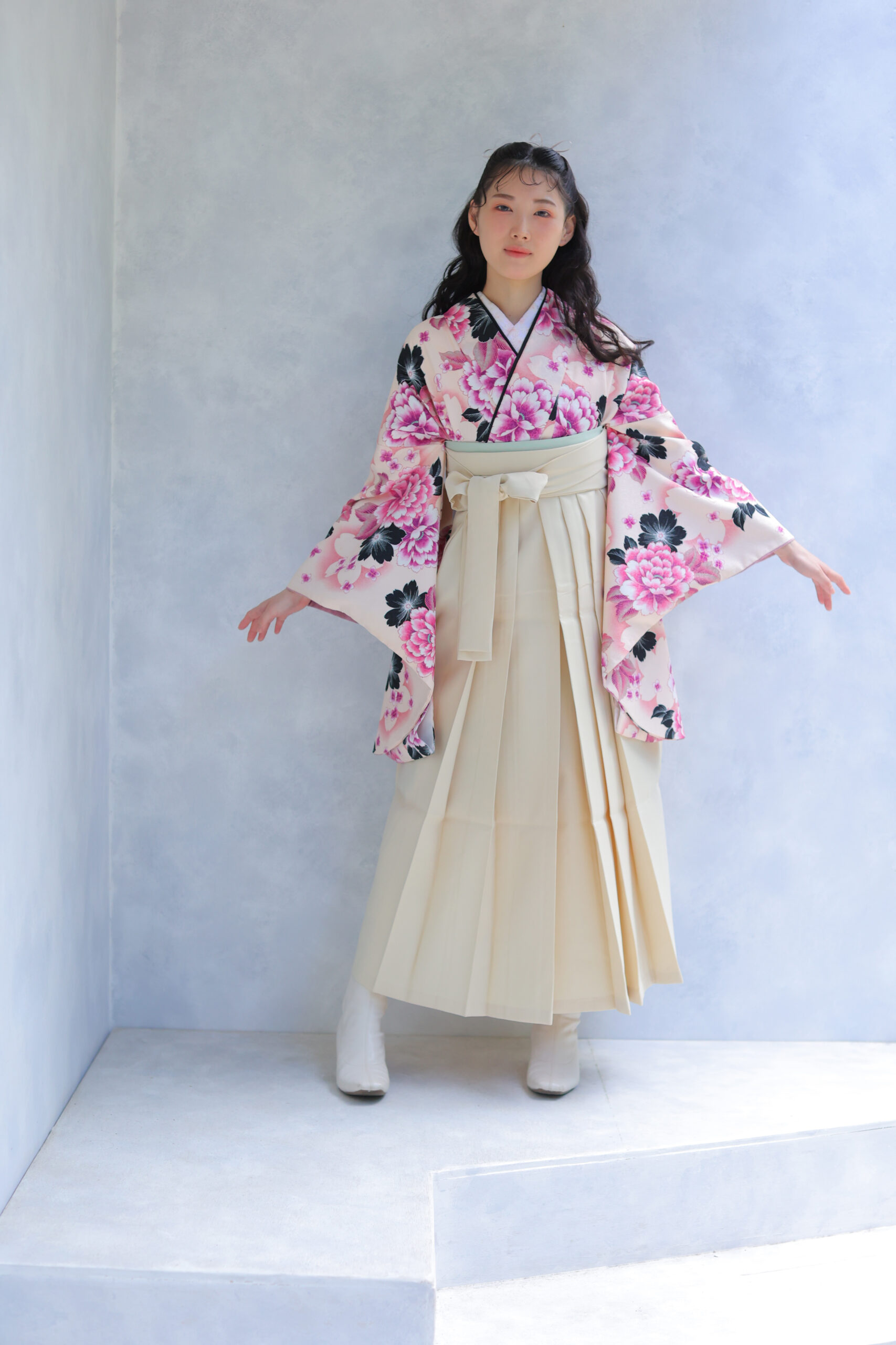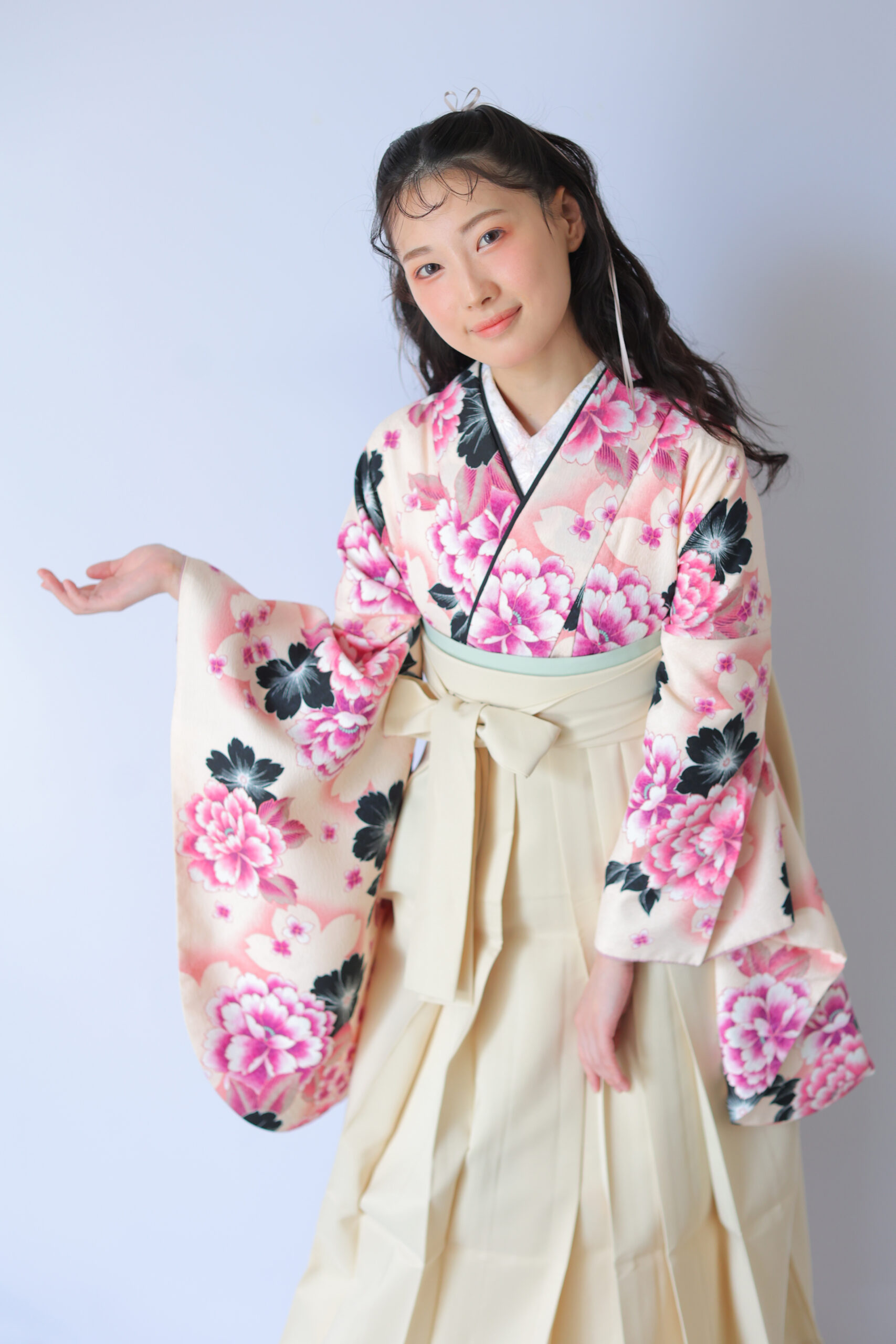 つぎにご紹介するのはこちらのコーディネート♡優しいピンクをベースに、鮮やかな牡丹の花柄があしらわれたお着物と、淡いクリーム色の袴の組み合わせです。このお着物は、卒業式という特別な日にぴったりの華やかさと可愛らしさが詰まったデザイン!大きな牡丹の花柄が上品でありながら、存在感もしっかりあって、晴れの日を明るく彩ってくれます。黒い葉がアクセントとなり、全体のデザインが引き締まって見えるのもポイントです。