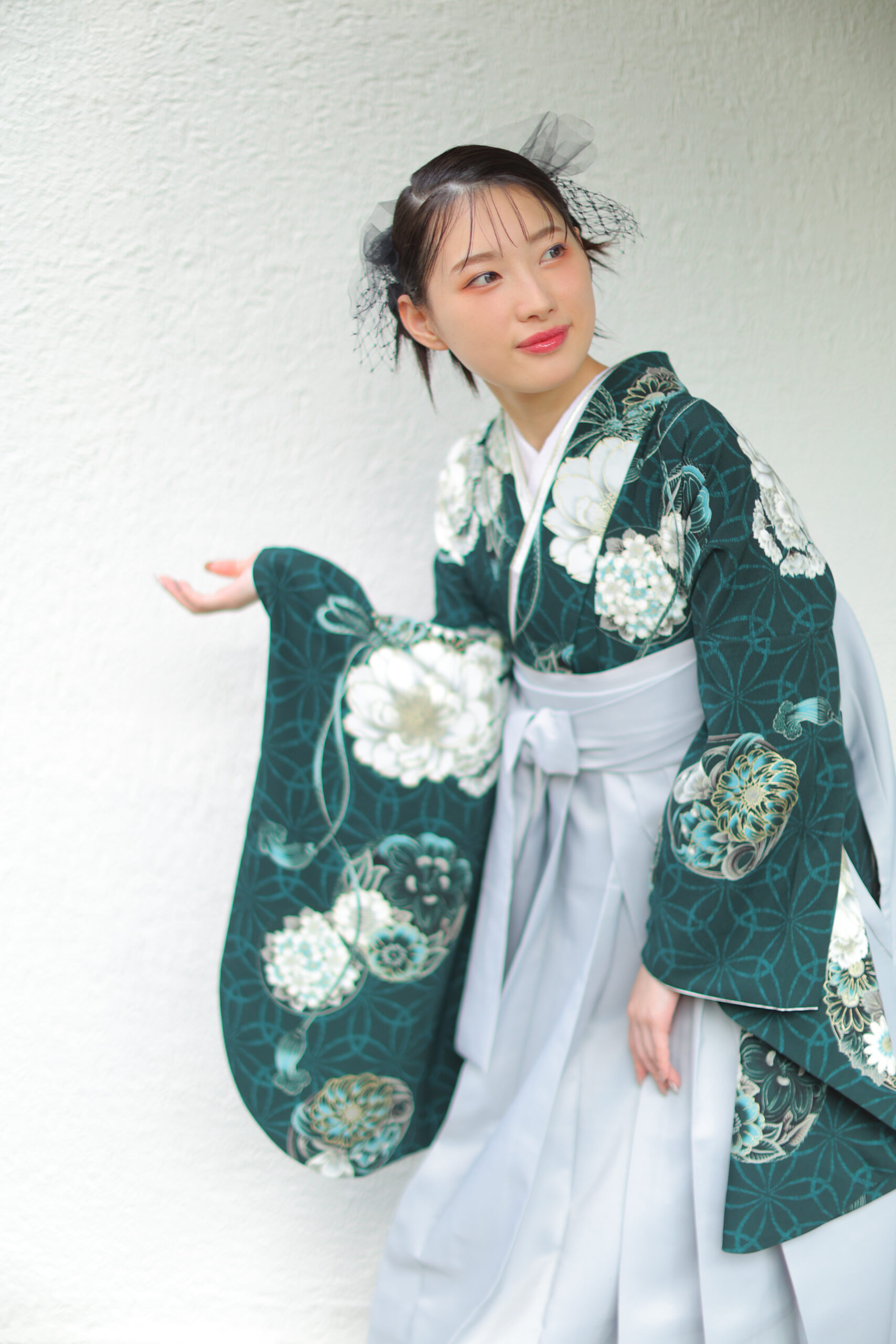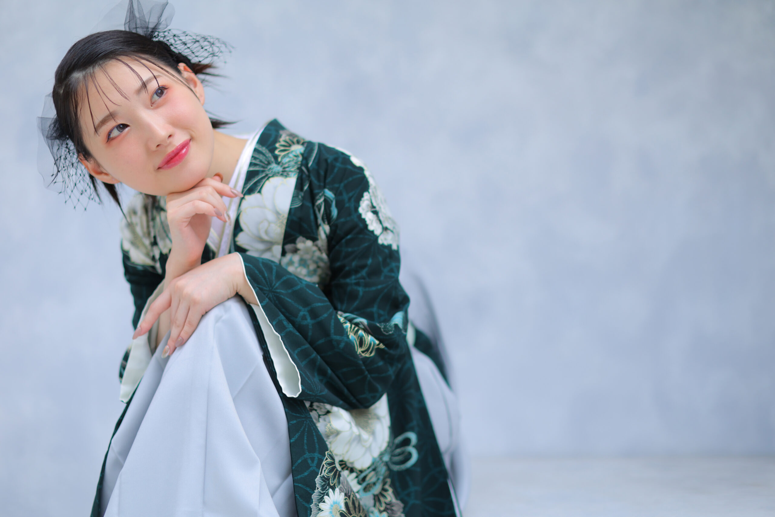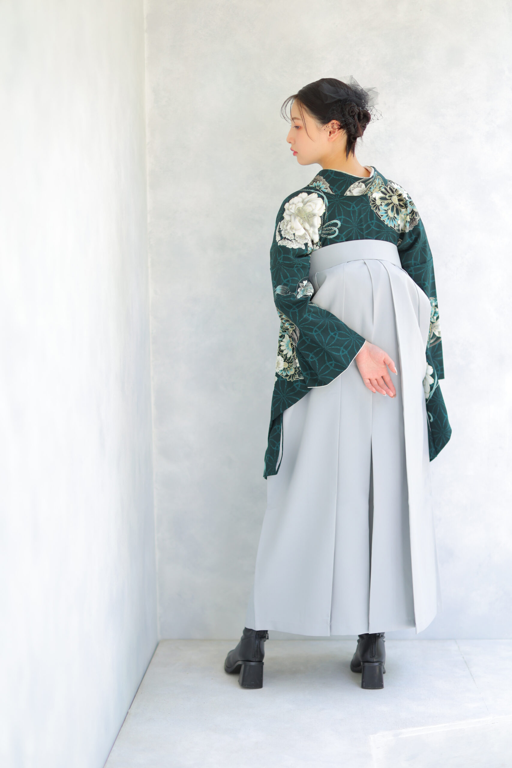 まず今年の新作コーディネートとしてご紹介するのは、深みのあるグリーンのお着物と淡いグレーの袴の組み合わせ♡