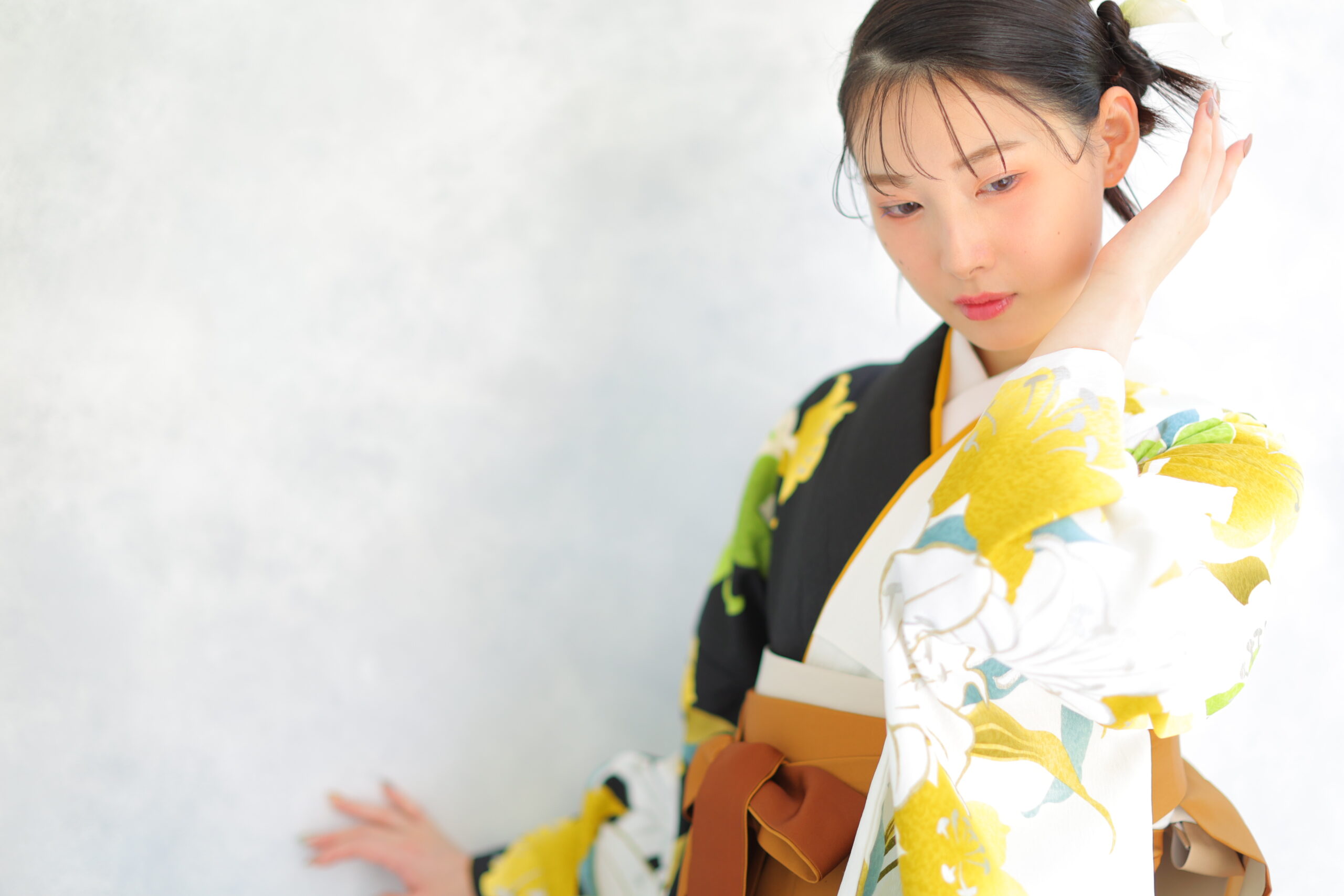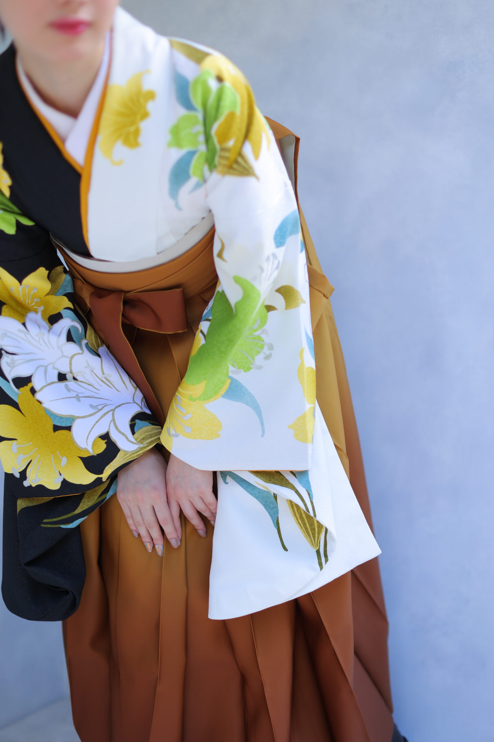 袴はマスタード系のグラデーションカラーが特徴的。深みのある色合いから淡いトーンへの移り変わりがとても美しく、歩くたびにその繊細な色合いが際立ちます。このカラーリングは個性的でありながらどこか落ち着きも感じさせるので、幅広い年代から支持されるスタイルです。グラデーションの柔らかな変化が、全体の印象をよりエレガントに仕上げています。