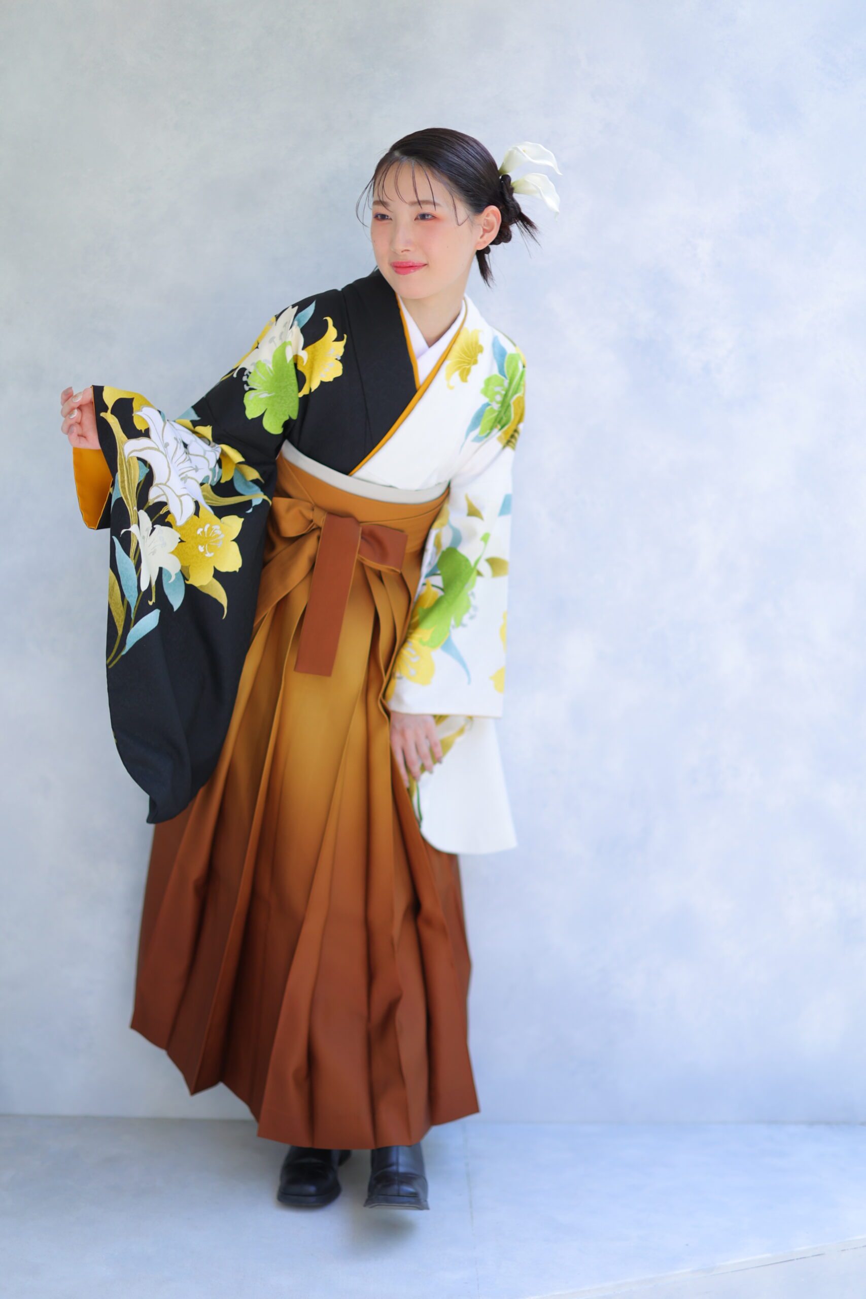 最後にご紹介するのは、黒と白のツートーンのお着物に大胆なカラーグラデーションの袴を合わせた、洗練された印象のコーディネートです。このスタイルは、伝統的な和装の中にモダンなエッセンスがしっかりと盛り込まれており、個性と上品さを兼ね備えた一着となっています。