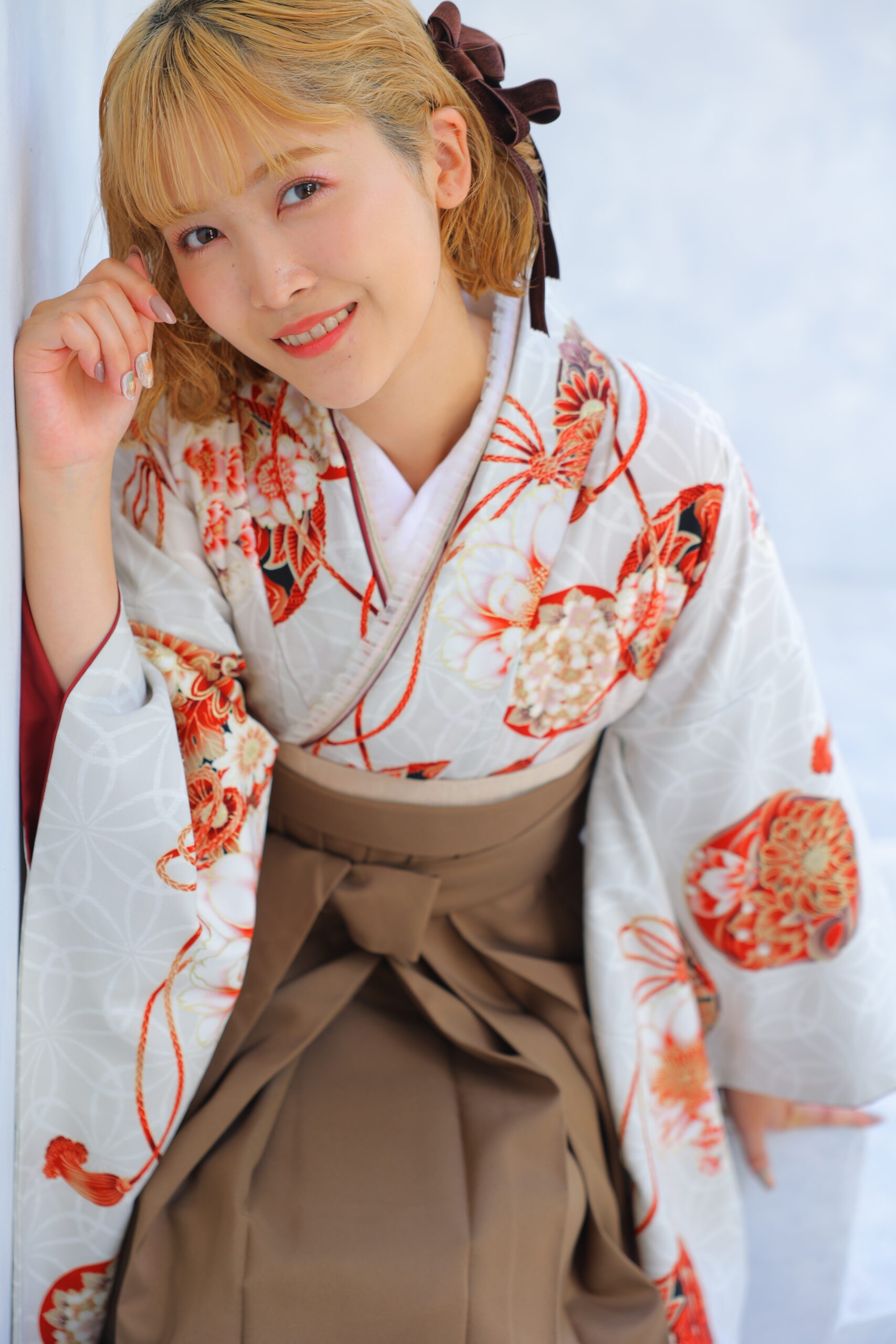 つぎの新作衣裳は、白地に赤の花柄のお着物にブラウンの袴のコーディネート♡この組み合わせは、華やかさと落ち着きを見事に両立していて、とても魅力的です!