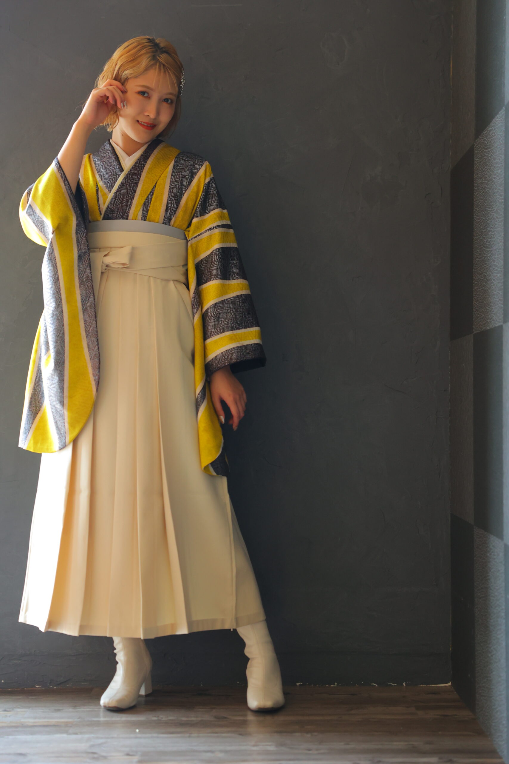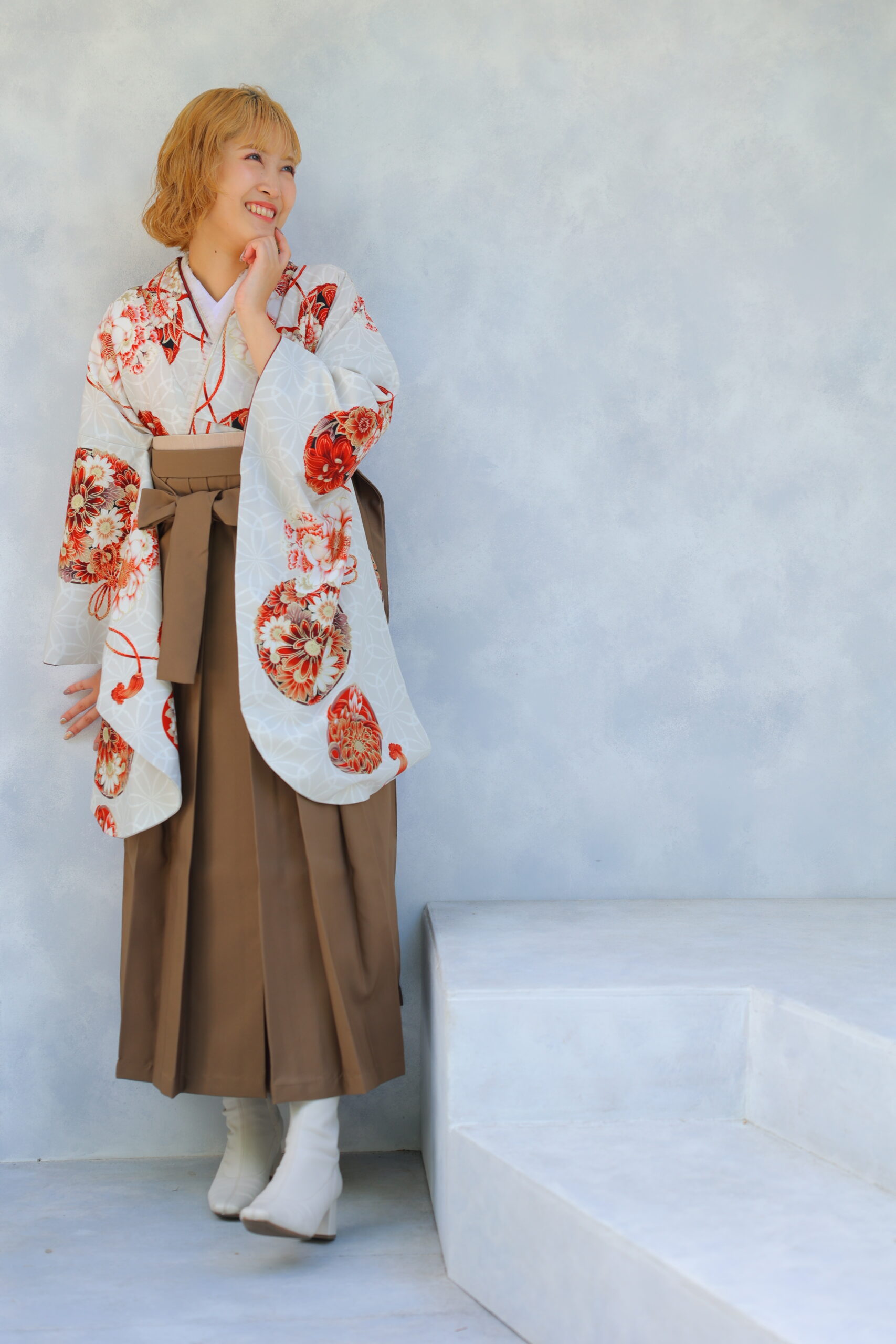 足元には白のブーツを合わせて、伝統的な和装にモダンな要素をプラス。ブーツを履くことでスタイルアップ効果も期待でき、動きやすさも抜群です。歩きやすく快適でありながら、おしゃれ度も高めてくれるブーツは、卒業式の装いには欠かせないアイテムです♪