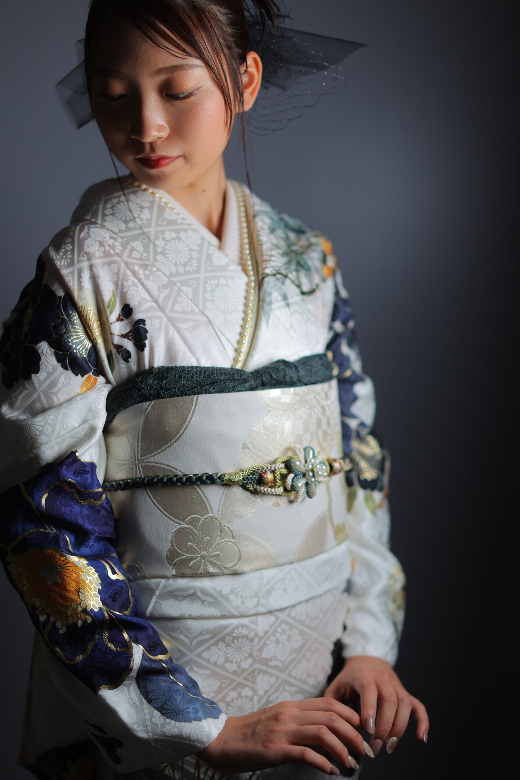 帯や衿といった小物類は、振袖の全体的な印象を大きく左右します。振袖に華やかな柄が多い場合、帯はシンプルなデザインを選ぶと、全体がうるさくならずバランスよく仕上がります。逆に振袖が無地またはシンプルな柄であれば、帯に華やかな柄を選ぶことで、コーディネートにアクセントが生まれます。このように、小物の色や柄のバランスにより個性や好みの雰囲気を作り出すことができます!ホワイトベルですと振袖担当衣裳スタッフと一緒に選ぶことができますので、好みを伺い、振袖を着た状態で小物を選ぶことができます。