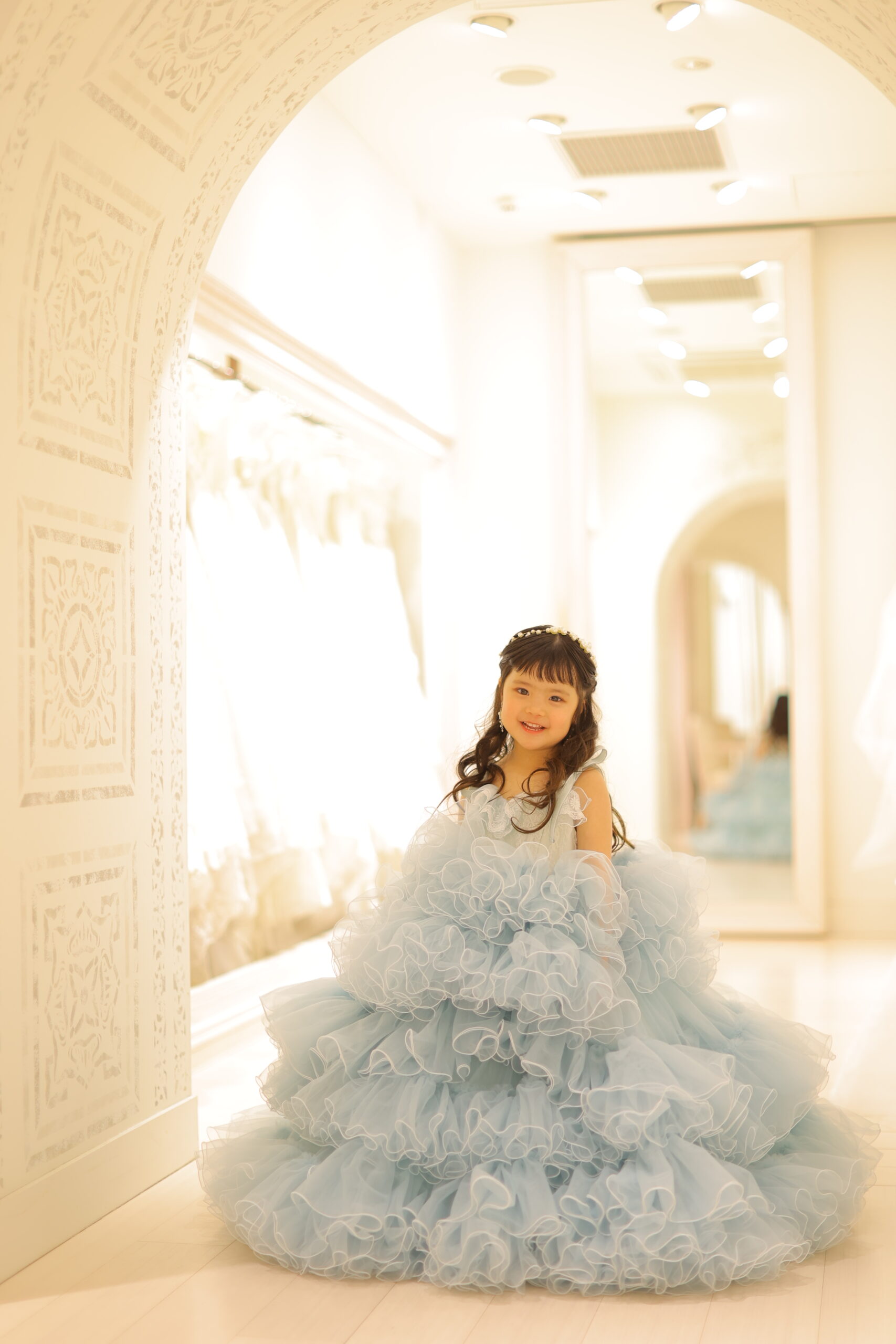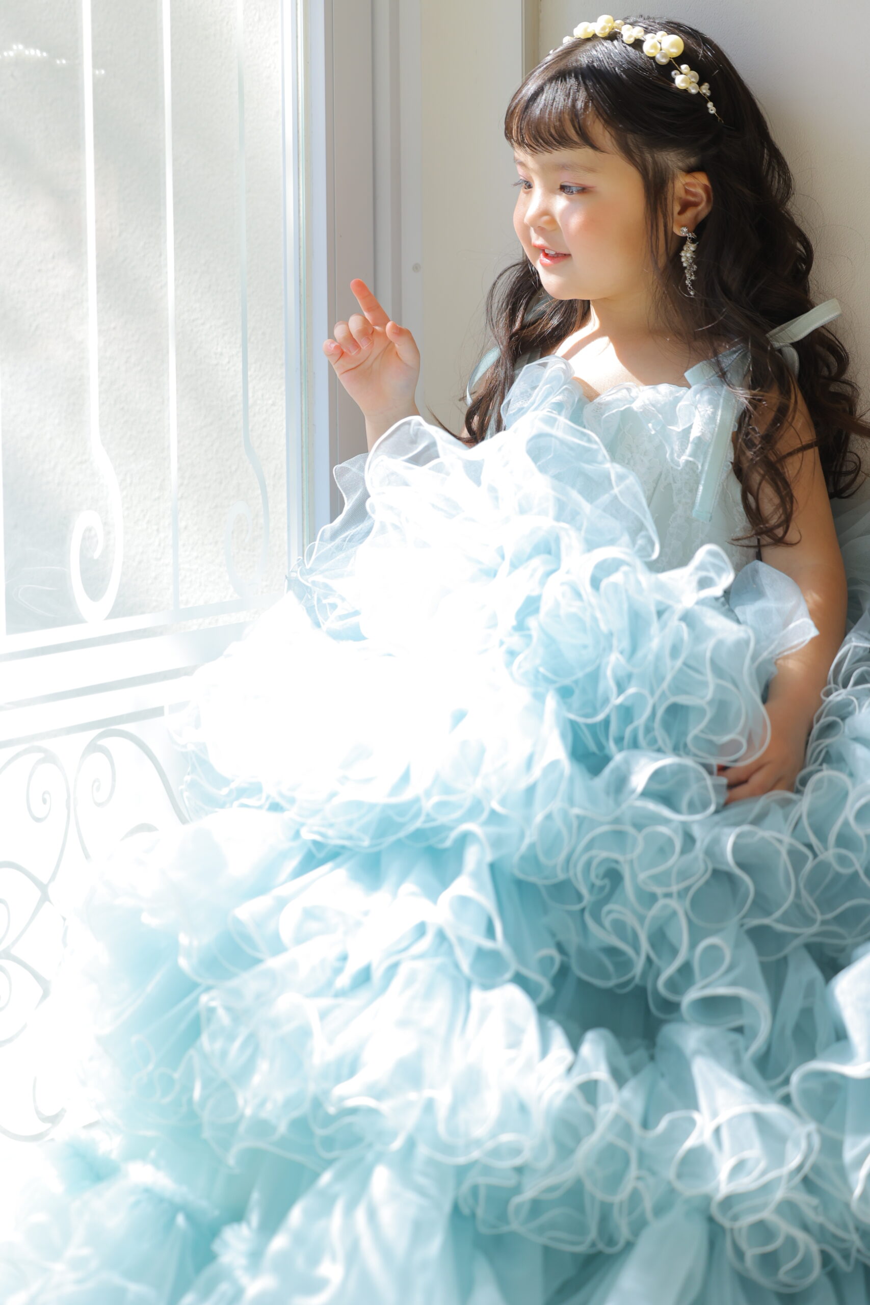 3歳女の子の新作衣裳としてご用意したのは、淡いブルーが印象的なSUGAR KEIブランドのドレスです。やわらかな色味とふんだんにあしらわれたチュールが特徴で、まるで空気をまとったような軽やかさが魅力の一着。七五三ではピンクや赤系の衣裳が定番ですが、このようなブルーカラーは「人と違う可愛さ」を演出できるため、近年人気が高まっています。ボリューム感のあるスカートは小さなお子様でも立体的に見え、写真にしたときの存在感も抜群です。また、やさしい色合いはお子様の透明感や柔らかい表情をより引き立ててくれるため、自然な雰囲気の撮影にもぴったり。可愛らしさとおしゃれさを両立したドレスです。