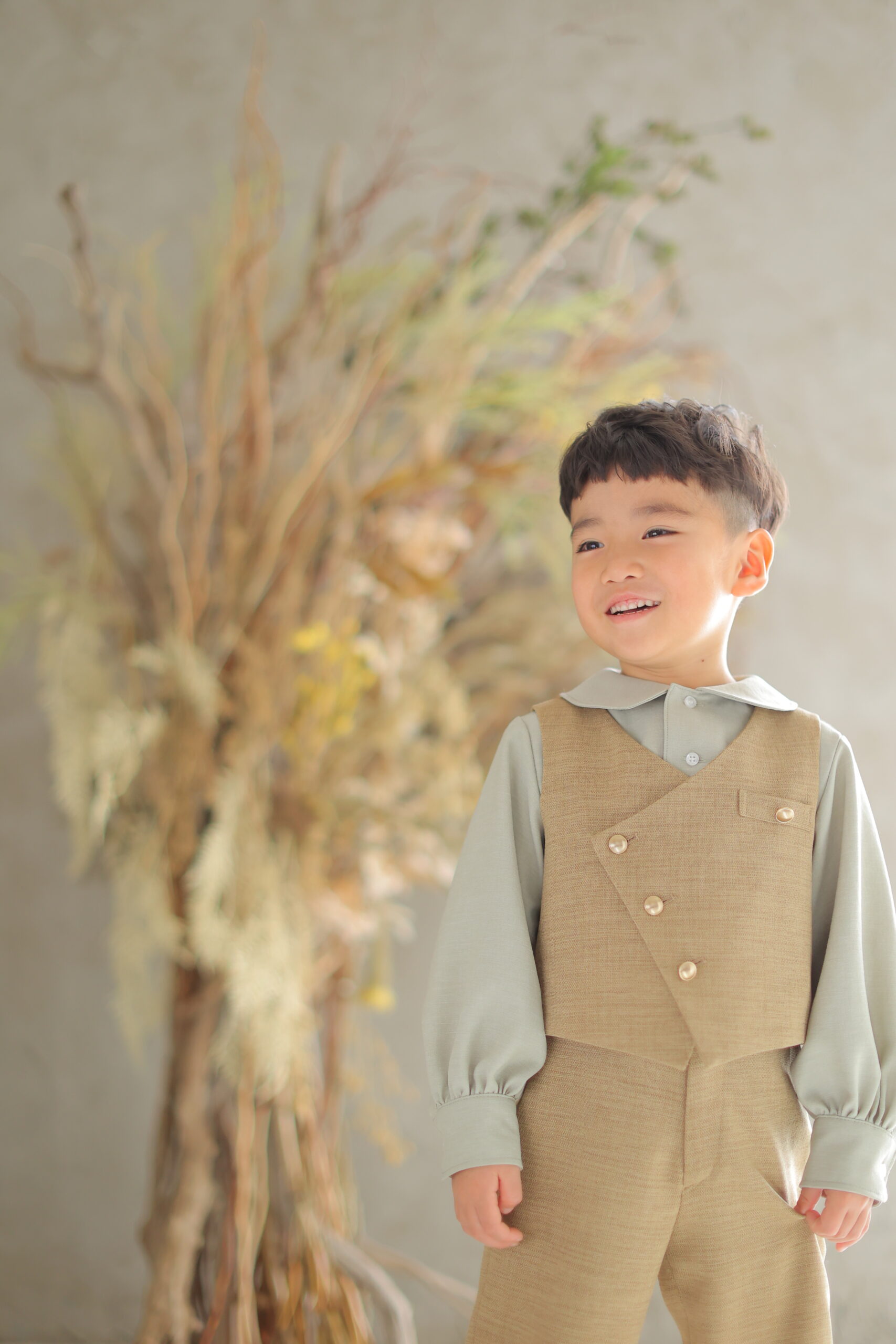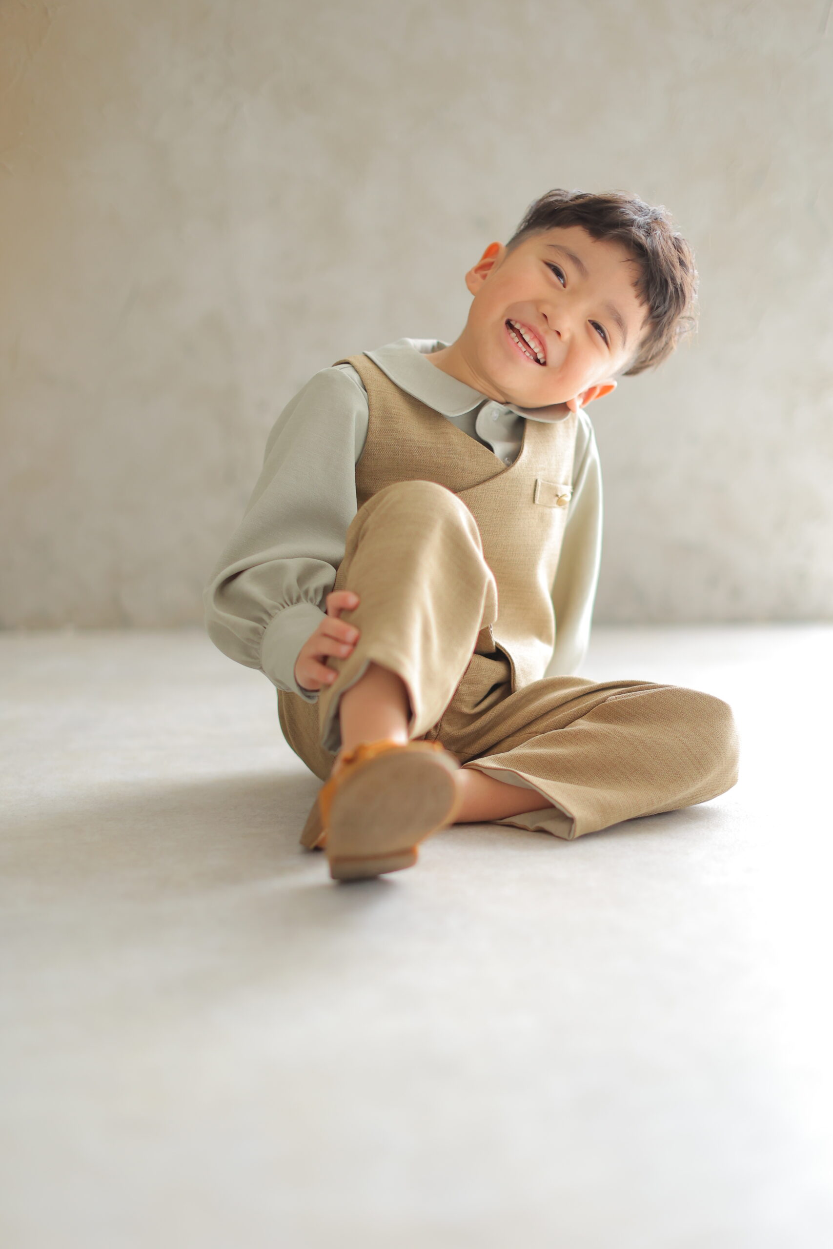 5歳男の子の新作衣裳は、やわらかなブラウンカラーが特徴のナチュラルテイストのタキシードスタイルです。七五三といえば和装のイメージが強いですが、近年は洋装スタイルも人気が高まっており、特にこうした落ち着いたカラーは「他の子と被らない」「おしゃれに残せる」と多くの親御様に選ばれています。ベージュ系のベストとパンツに、くすみグリーンのシャツを合わせたコーディネートは、優しく柔らかい印象を演出し、お子様の自然な笑顔を引き立ててくれます。また、かっちりしすぎないデザインのため、緊張しやすいお子様でも動きやすく、撮影中もリラックスして過ごせるのも魅力のひとつです。七五三の記念を少し特別に、そして今っぽく残したい方におすすめの一着です。