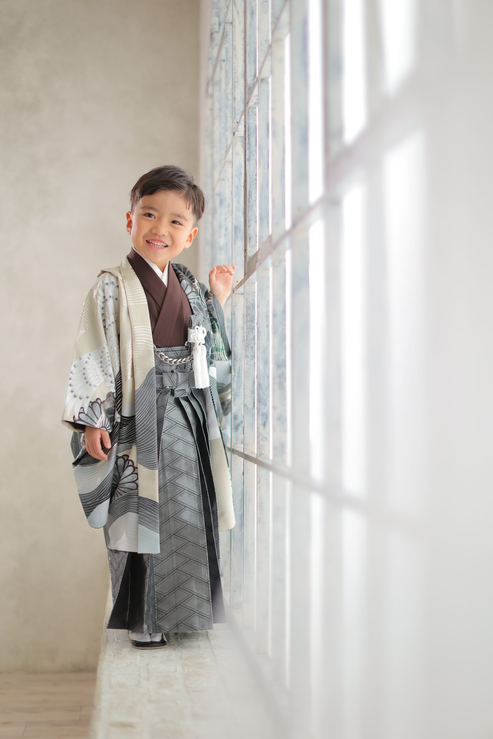 ブラウンとグレーを基調としたこちらの5才男の子の新作衣裳は、落ち着いた色味の中に洗練されたおしゃれさを感じる一着です。伝統的な和柄を取り入れながらも、現代的な配色でまとめることで、格式とトレンドの両方を叶えています。シンプルすぎず、かといって派手すぎない絶妙なバランスは、写真に残したときにお子さまの表情や仕草をより引き立ててくれるのも魅力。七五三らしいきちんと感を大切にしたい方や、ナチュラルで大人っぽい雰囲気がお好みのご家族に特におすすめです。スタジオ撮影はもちろん、神社やロケーション撮影でも景色に馴染みやすく、どのシーンでも上品に映える万能な一着です。