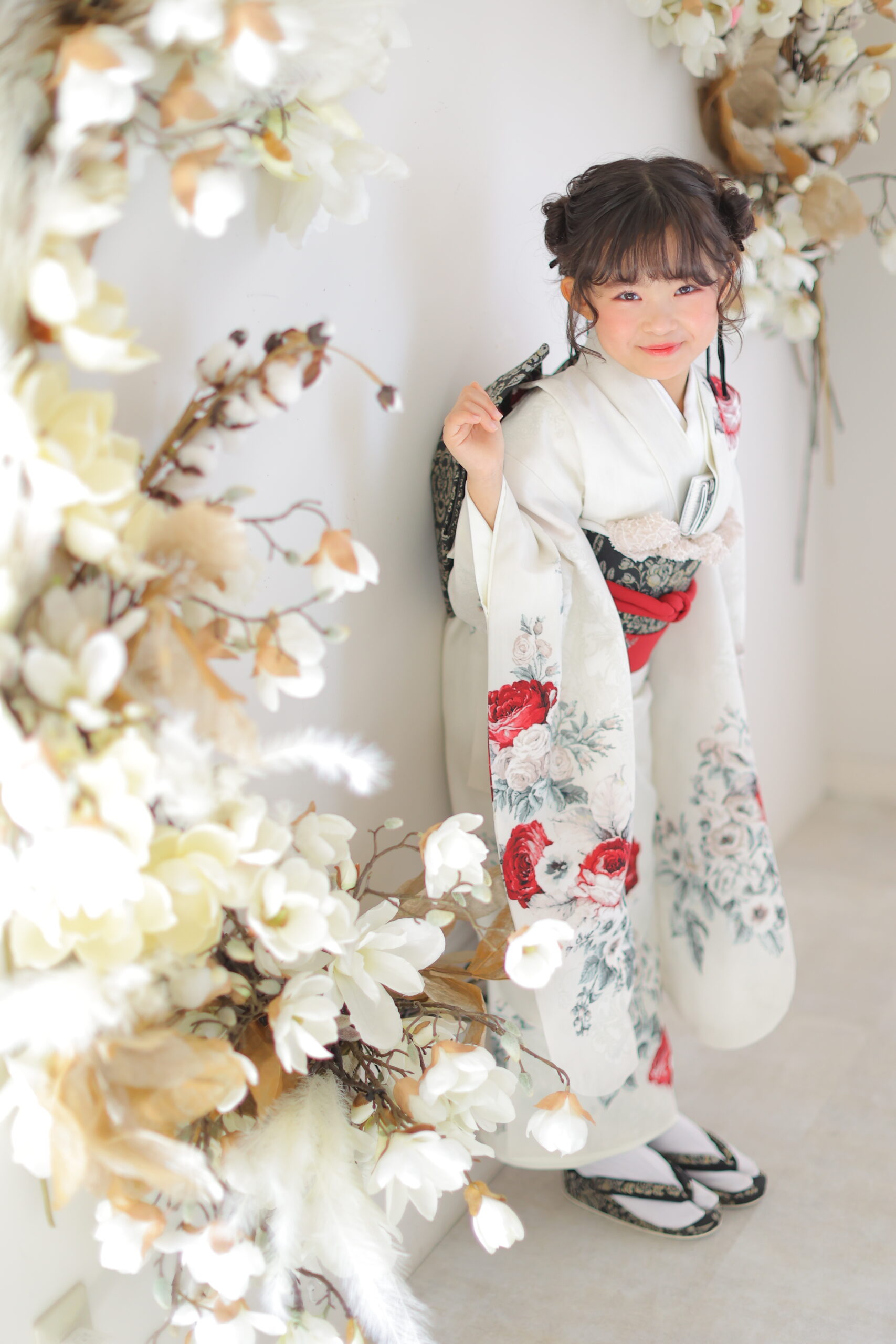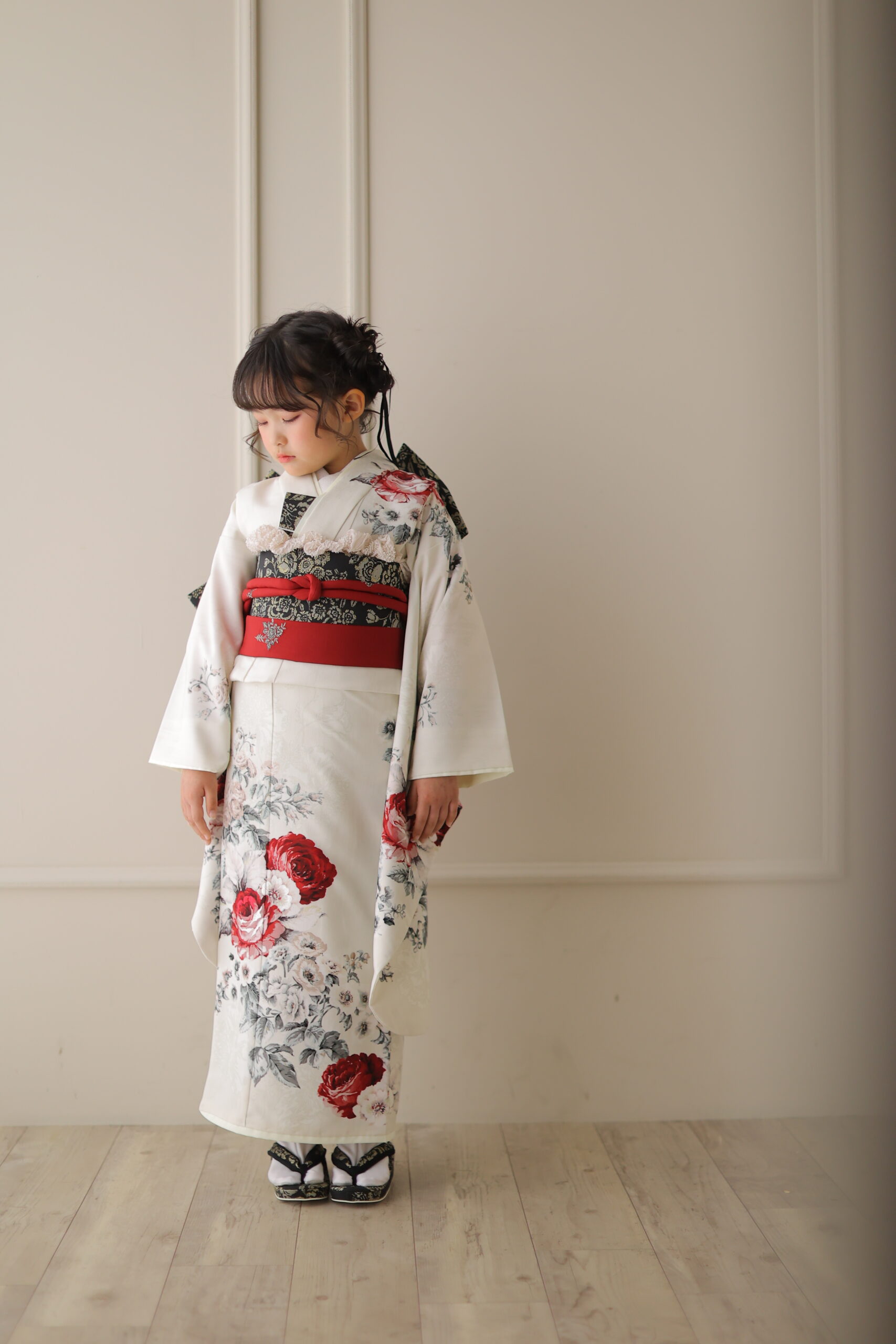 人気ブランド「JILL STUART」の7才衣裳は、上品さと華やかさを兼ね備えた王道スタイルが魅力です。ホワイトをベースに繊細な花柄が施されており、やわらかく優しい印象を与えながらも、しっかりと存在感を感じられるデザインになっています。アクセントとしてあしらわれた赤い帯が全体を引き締め、写真映えする華やかさをプラス。可愛らしさの中にも上質感があり、七五三という特別な節目にふさわしい一着です。明るいスタジオはもちろん、自然光のロケーションでも美しく映えるため、どんな撮影スタイルにも対応可能。可愛いだけでなく「きちんと感」も大切にしたい親御様におすすめの衣裳です。