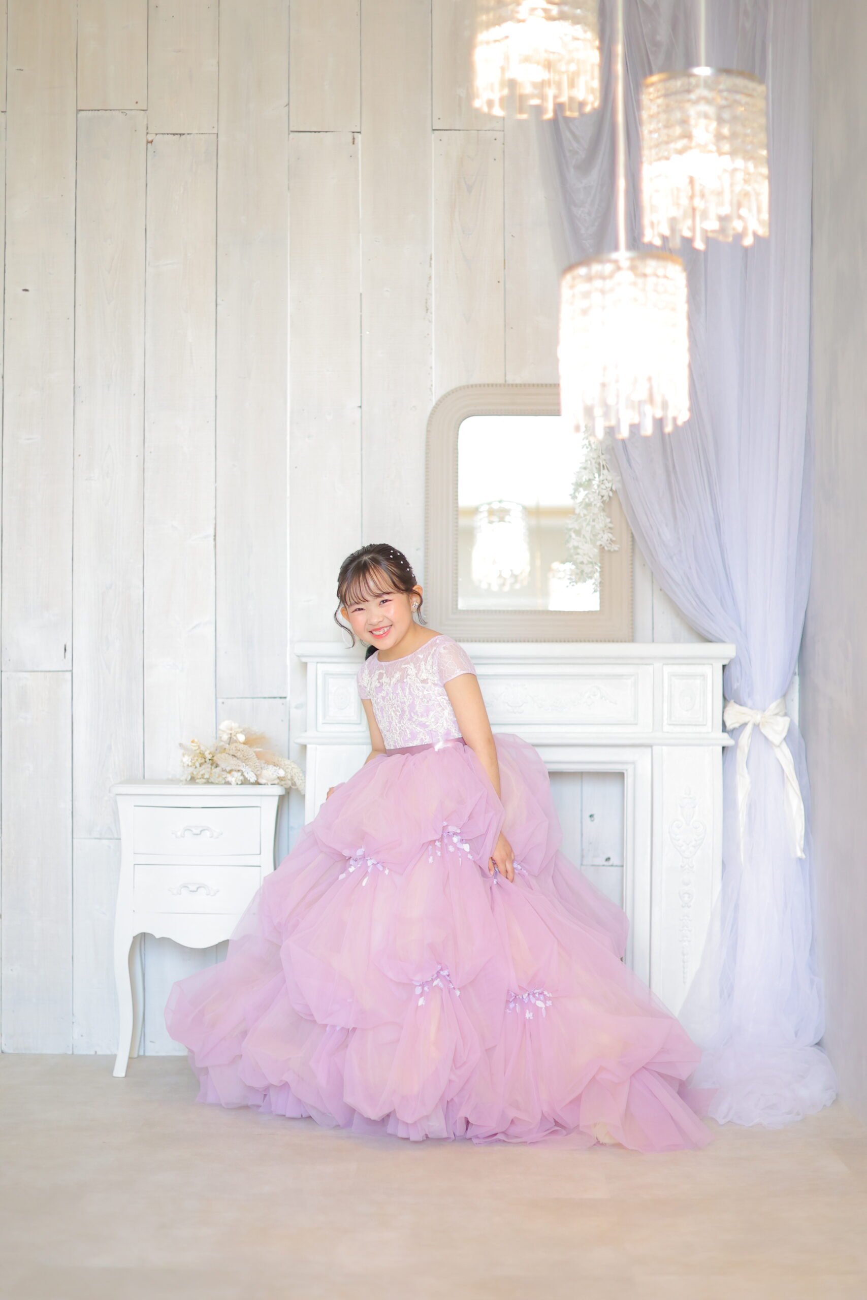 7歳女の子の新作衣裳として登場したこちらのドレスは、繊細なレースとふんわりとしたチュールが重なり合う、特別感あふれる一着です。淡いパープルカラーは可愛らしさだけでなく上品さも兼ね備えており、「子どもっぽすぎないドレスを着せたい」という親御様にもぴったり。ボリューム感のあるスカートは歩くたびにふんわりと広がり、まるでプリンセスのような華やかな印象を演出してくれます。また、肩まわりのレースデザインが顔まわりを優しく見せてくれるため、写真映えも抜群です。七五三の記念写真をより華やかに、そして特別な思い出として残したい方におすすめの衣裳であり、和装との2着撮影にも人気が出そうな一着です。