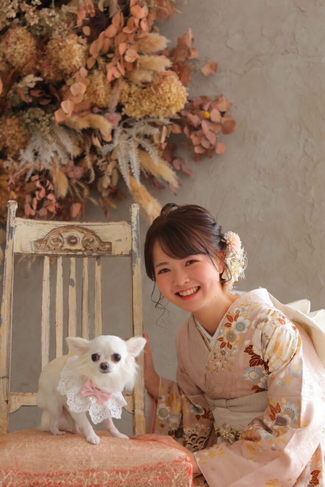 ※当店の衣裳をレンタル(お持込みの振袖以外)での撮影の場合、ペットを抱っこしての撮影が難しくなります。ご了承くださいませ。