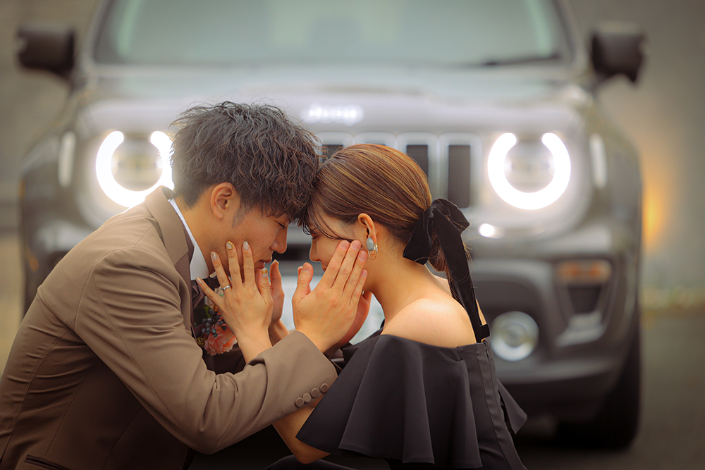 愛車をバックにあくまでメインはお二人。お車のヘッドライトを付けるとぼかしたときにふんわりと光ってエモい写真に早変わり。