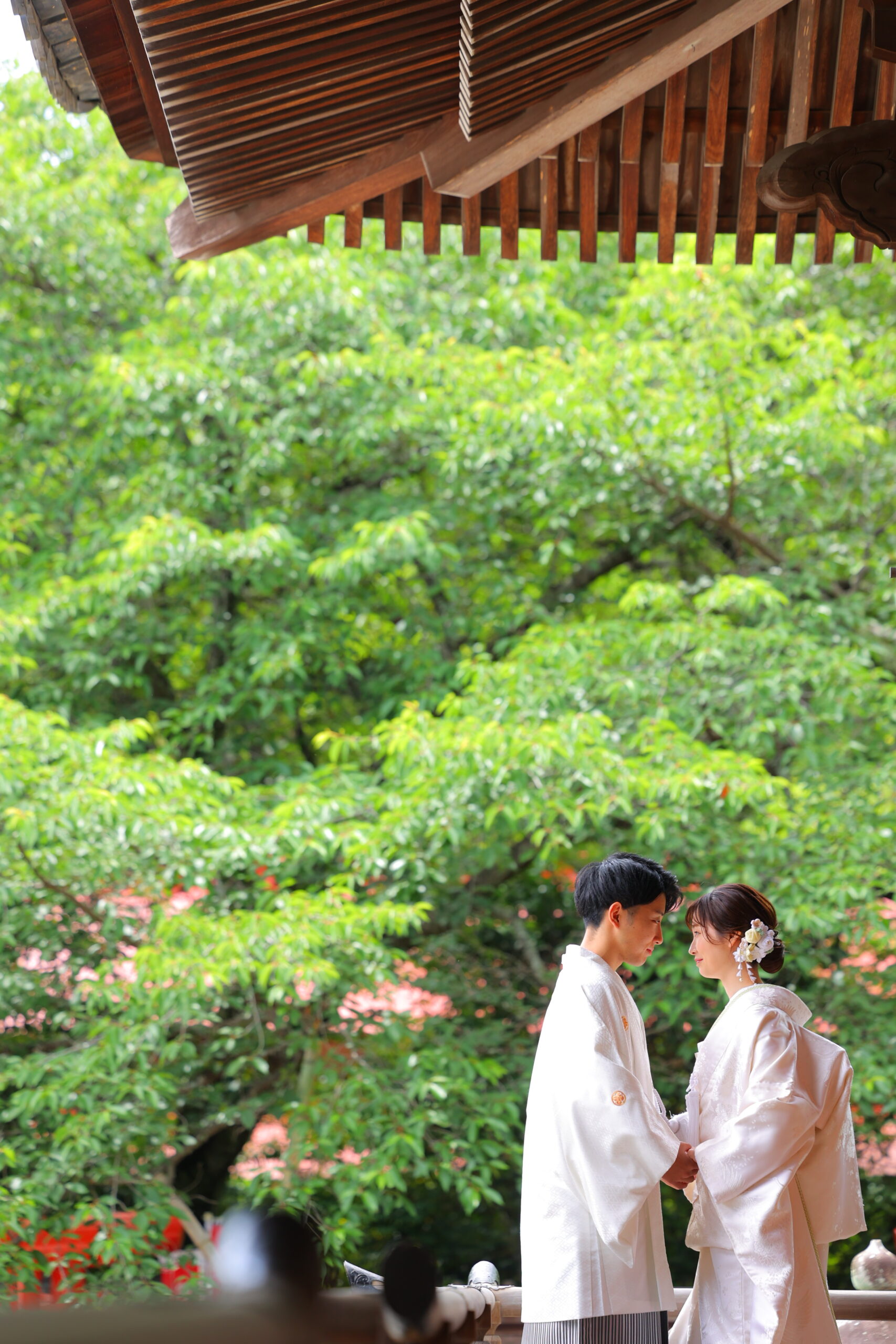 光をたっぷり受けた若葉の明るい緑に、白無垢の透明感と柔らかさが映えて、まるで一枚の絵画のように仕上がります。