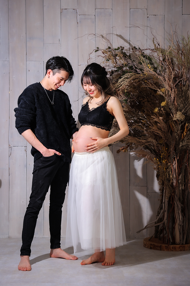 肌見せのシンプルなスタイルや、モノクロ撮影で美しさと力強さを強調した1枚も人気。感情や体のラインが際立つ、アート性の高いマタニティフォトです。