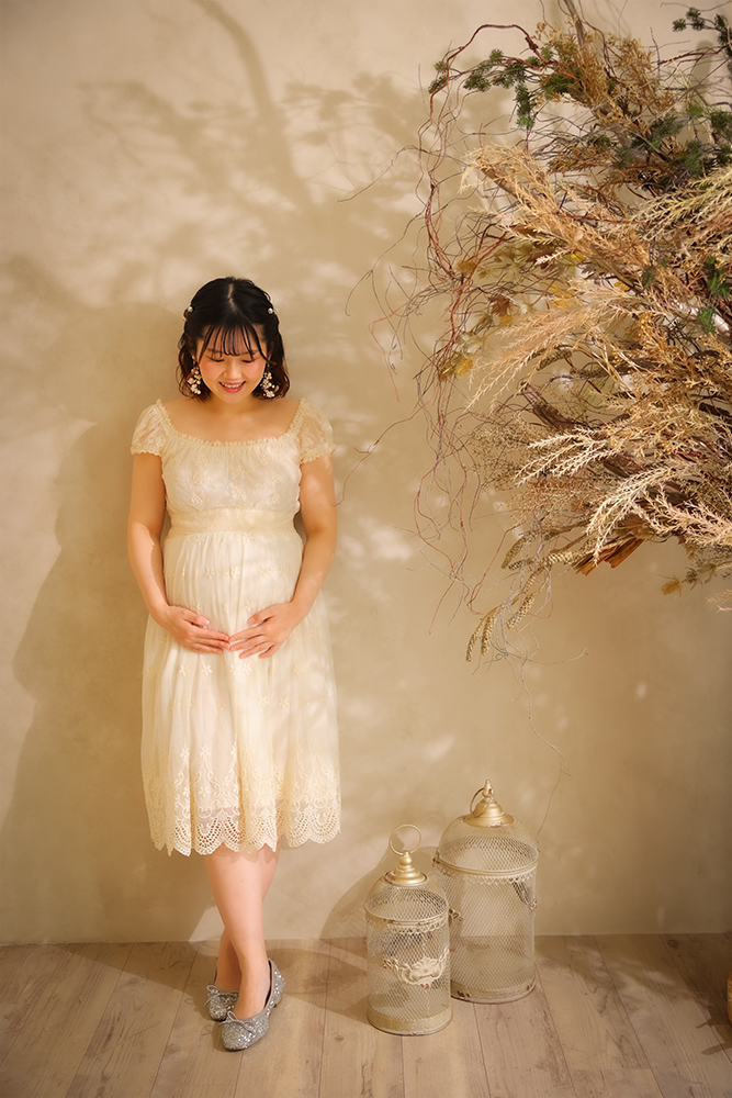 マタニティ撮影で大切にしているのは、**「あなたらしい雰囲気を表現すること」**です。どんな衣装やライティングが合うのか、リラックスできるポーズは何か…カメラマンが丁寧にご提案します。希望があれば、エコー写真やベビーシューズ、名入りアイテムなどの小物も持ち込み可能。撮影前にイメージを相談いただければ、衣装や背景、小道具までトータルでご提案できます。