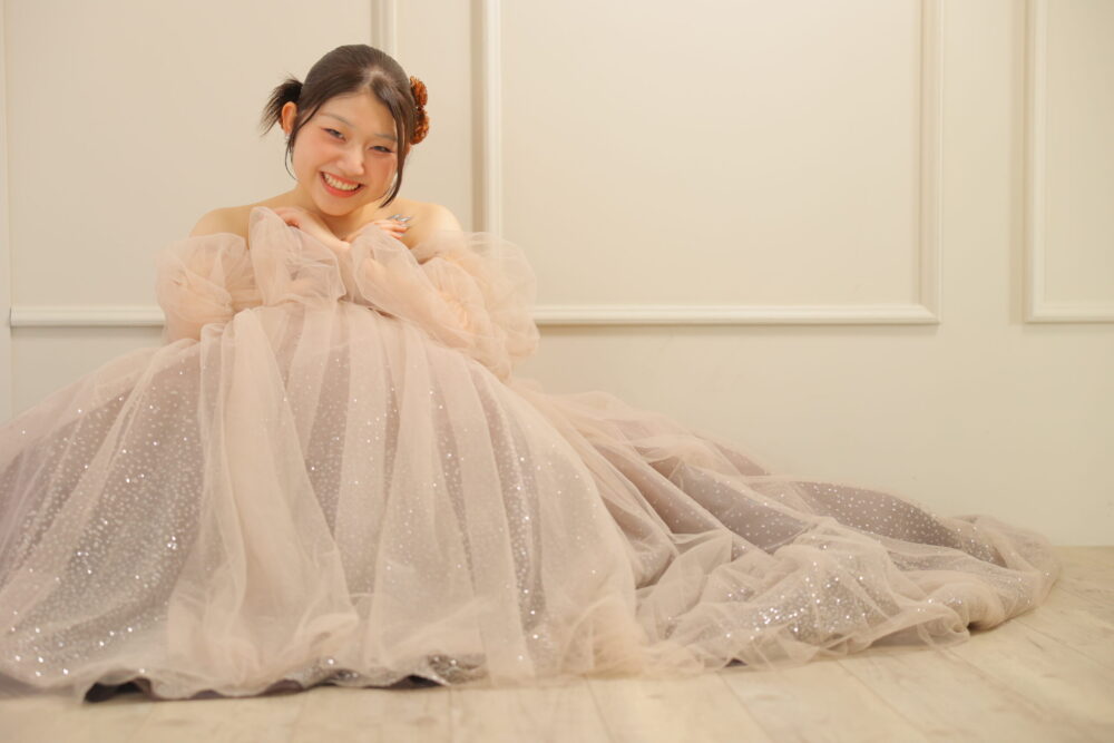 振袖とはまた違った雰囲気を楽しめるのが、ドレス撮影の魅力の一つ。シンプルで洗練されたシルエットから、ふわっと広がるボリュームドレスまで、デザインやカラーによって印象は大きく変わります。たとえば、自分の好きな色を取り入れたカラードレスでの撮影は「らしさ」を大切にしたい方におすすめ。さらに、髪型やアクセサリーを自由にコーディネートできる点も嬉しいポイント。ティアラや生花、レースグローブなどを使って、ウェディングさながらの華やかな一枚を残すことができます。「二十歳の記念写真」として、個性をしっかり表現できるのはドレス撮影ならではの醍醐味。振袖とのギャップも楽しみながら、あなただけのスタイルで特別な写真を残しませんか?