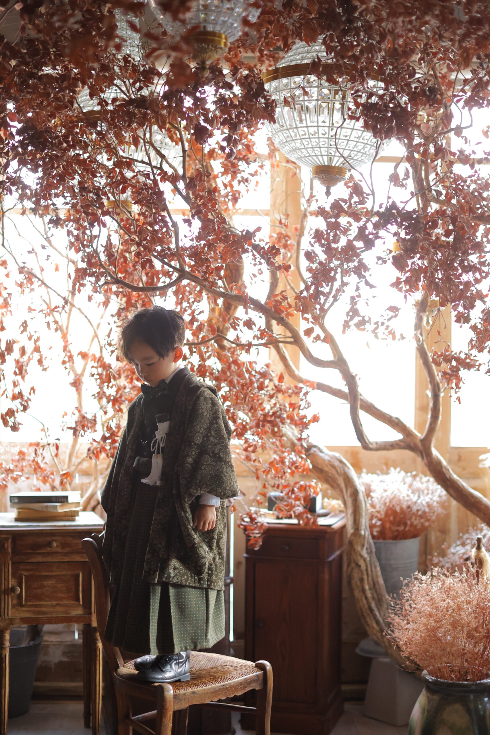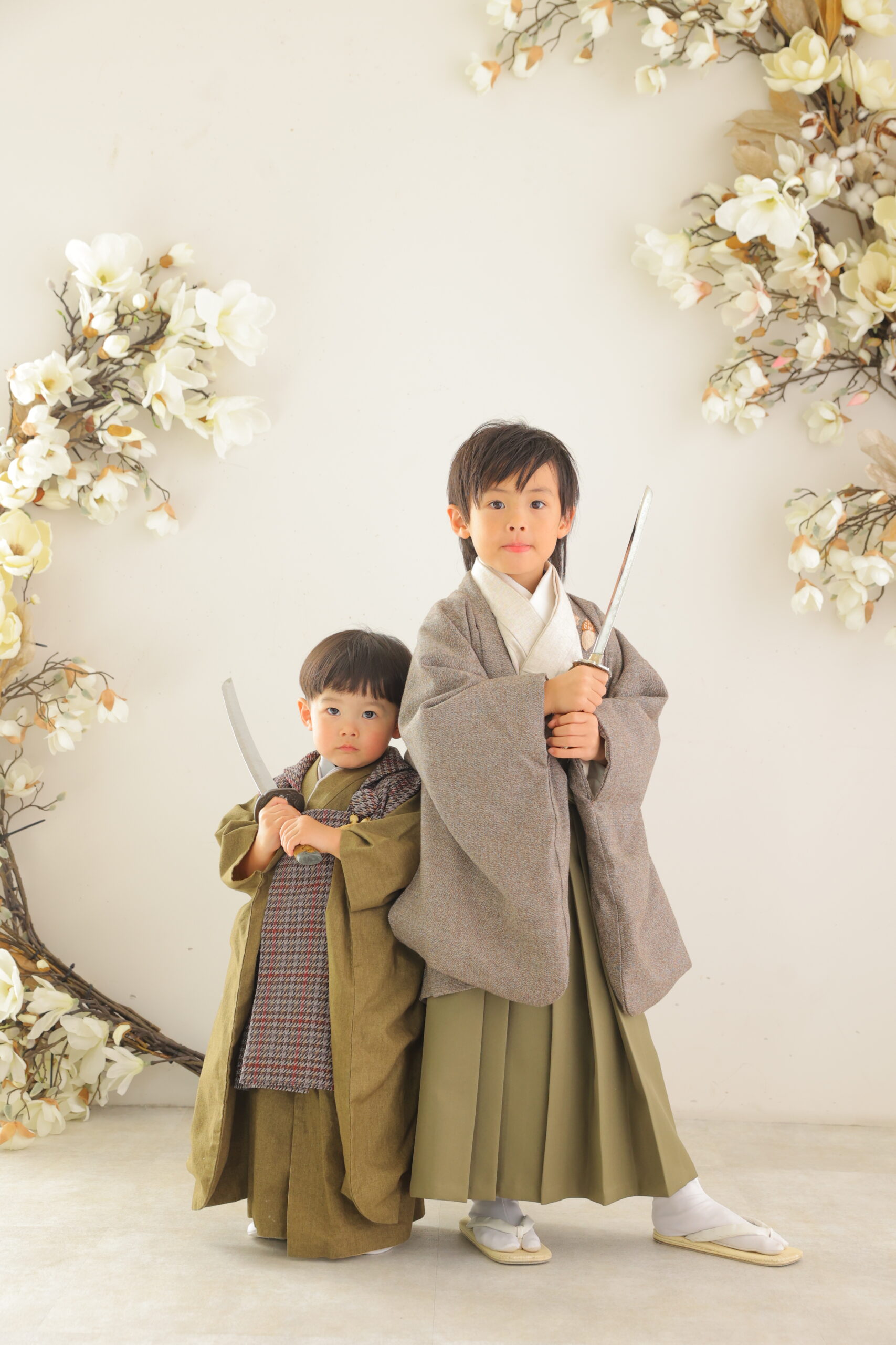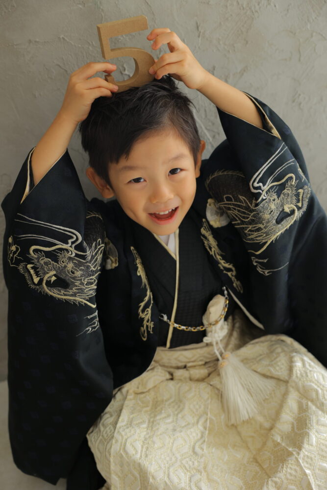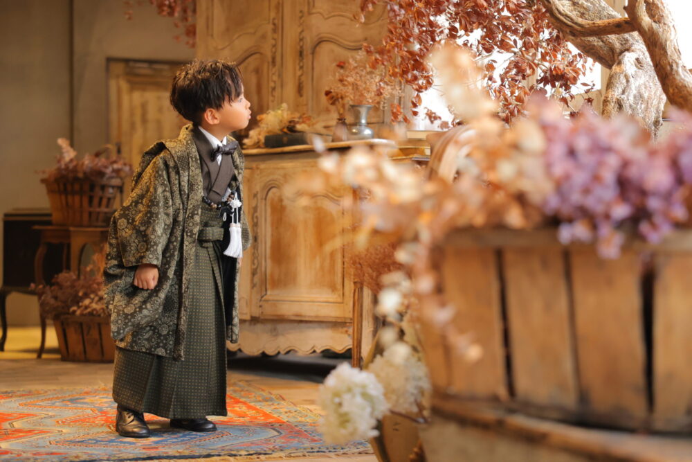 男の子は羽織袴を着用し、凛々しい姿が印象的です。中には5歳の時は袴姿、3歳は女の子と同じように被布スタイルのお着物を着る方も。