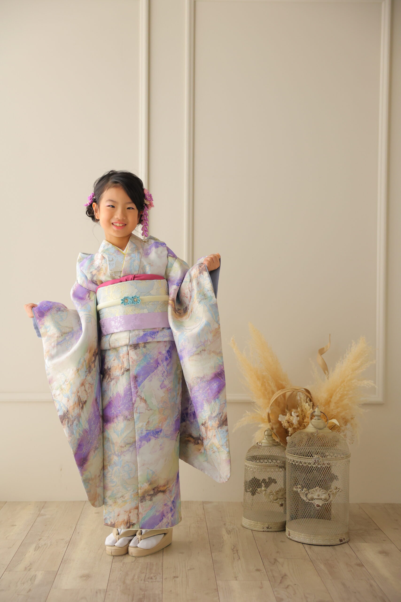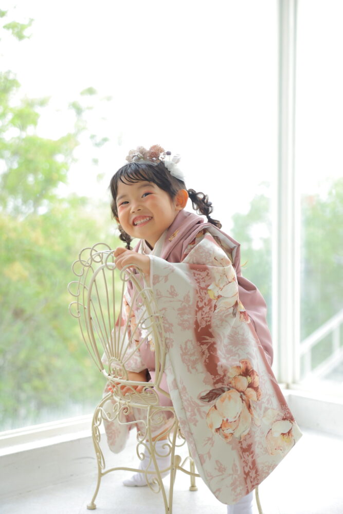 7歳の女の子は帯を結ぶ本格的な振袖スタイルになり、ぐっとお姉さんらしい雰囲気に。正面からも後ろ姿も写真映えします。