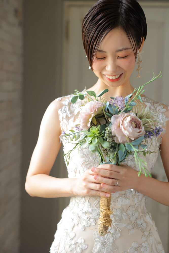 近年人気のナチュラルウェディングにも、ショートヘアはぴったりです。ラフな質感を残しつつ、ドライフラワーやグリーンをあしらえば、肩の力を抜いた自然体の花嫁に。