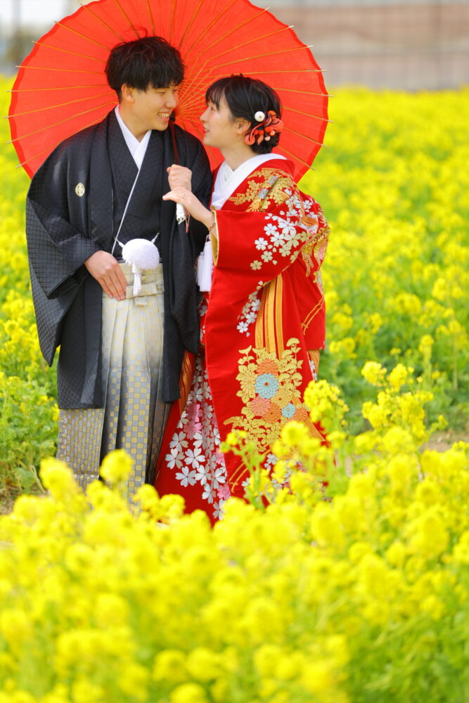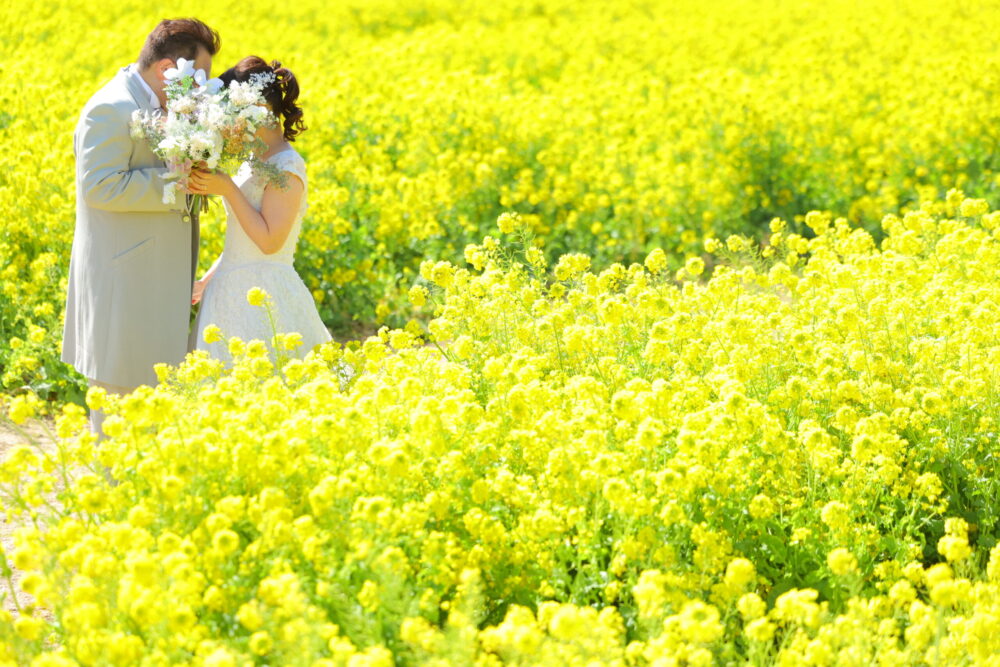 屋外撮影では、ヘッドアクセサリーの存在感もスタジオ以上に重要です。広い背景の中では、小さすぎるアクセサリーは埋もれてしまうことがあります。桜ロケーションには、ゴールドやパールをあしらった繊細なデザインや、花モチーフのアクセサリーがおすすめです。一方、菜の花ロケーションでは、白やアイボリーなど明るめの色味を選ぶことで、黄色の花畑の中でもバランスよく映えます。風でずれにくいよう、しっかり固定できる仕様かどうかも事前に確認しておくと安心です。