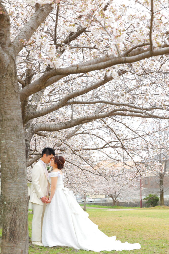 春の日差しはやわらかく、透明感のある写真を残せる反面、時間帯によっては逆光やトップからの強い光が入ることもあります。分け目がくっきり出すぎたり、頭頂部が平面的に見えてしまうことがあるため、ヘアセットでは立体感を意識することが大切です。トップに程よいボリュームを出し、後れ毛や顔まわりに動きをつけることで、光を受けたときに柔らかく女性らしい印象になります。特に桜ロケーションでは、光と花びらが重なるため、作り込みすぎないナチュラルさが映えます。