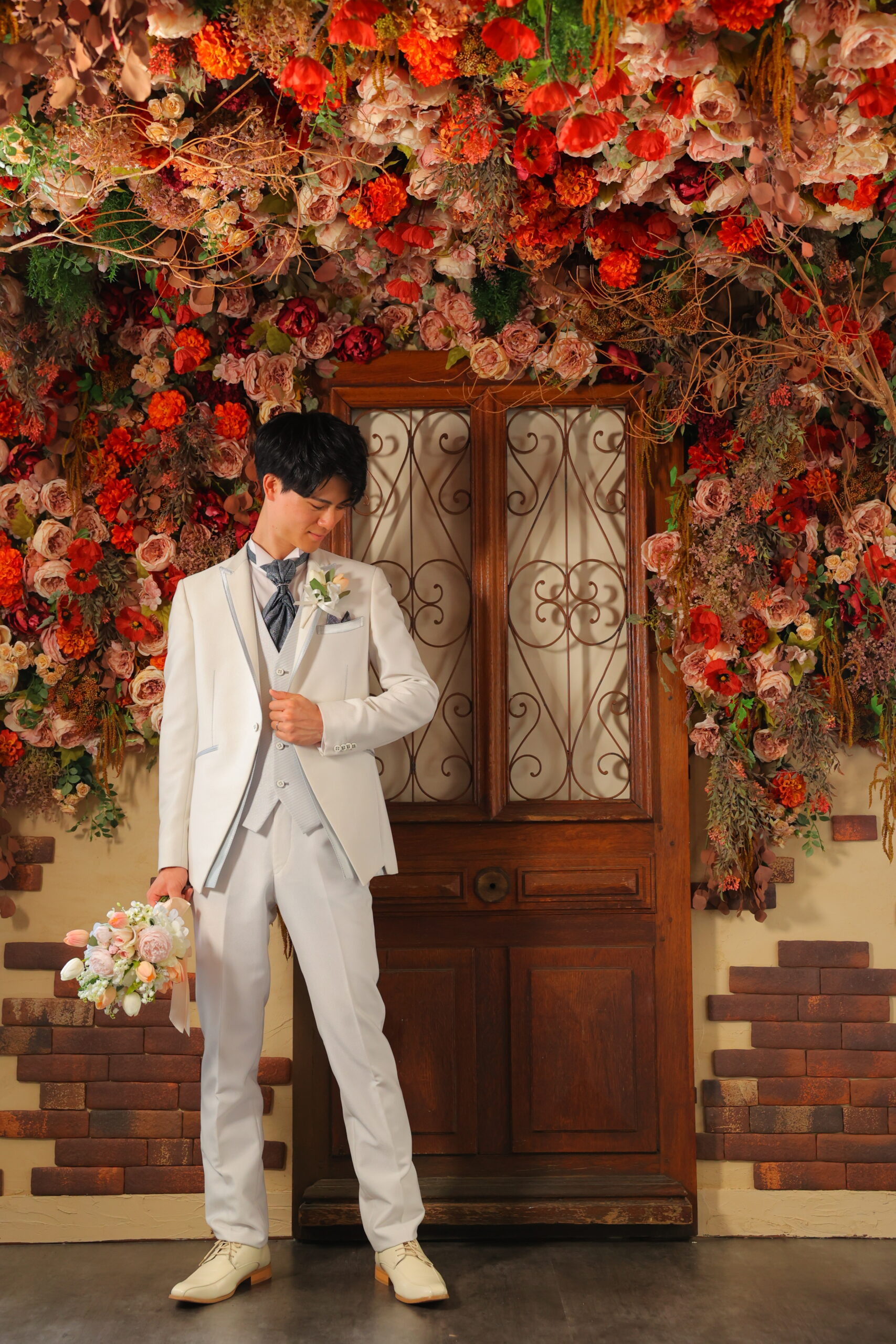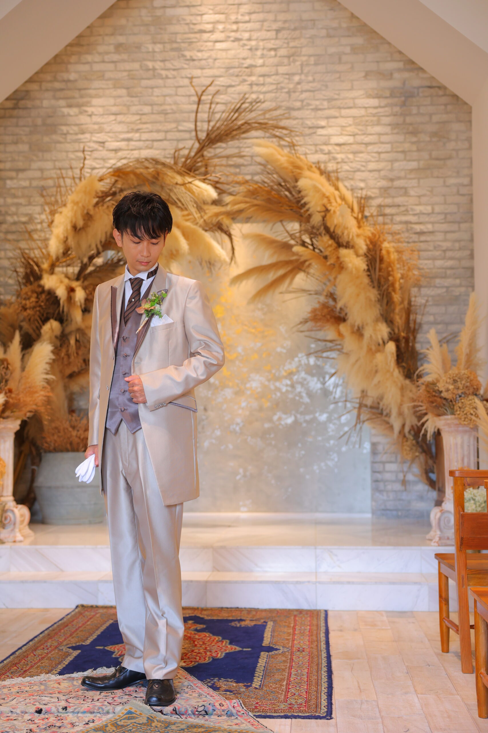 ベージュのタキシードは、軽やかで明るい雰囲気を纏えるのがポイント。ナチュラルで爽やかな印象を引き出し、花嫁様のウエディングドレスや淡いニュアンスカラーのドレスとも相性抜群です。柔らかな色合いが背景と調和し、アンティークな雰囲気のスタジオにも映える1着です!