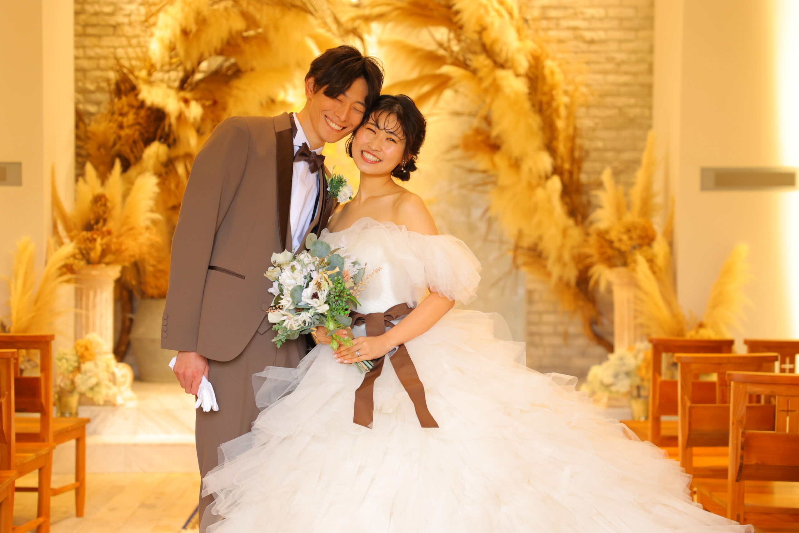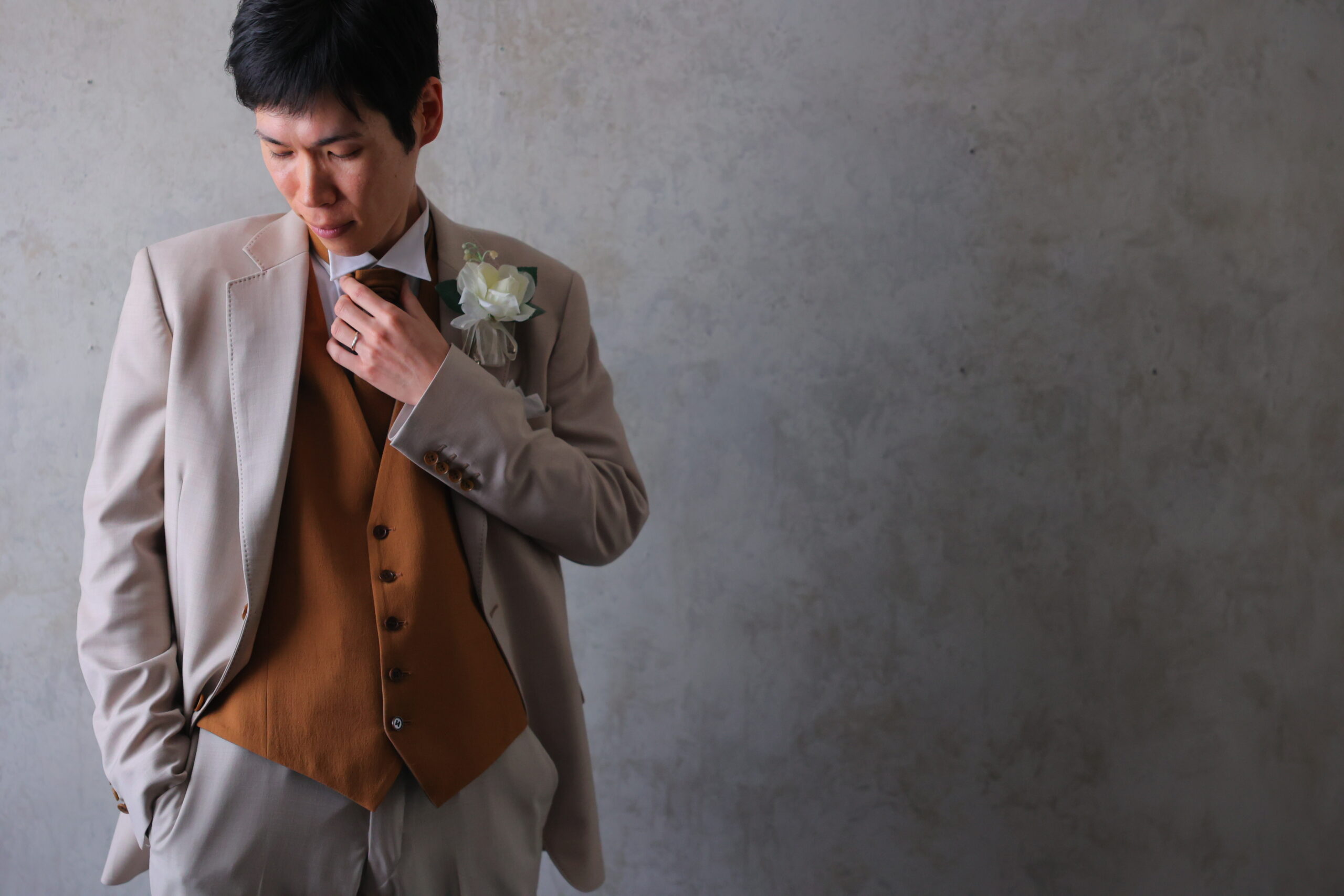 ベージュもブラウンも、アクセサリーや小物で印象を自在に変えられるのも魅力です。蝶ネクタイやベストを差し色にして華やかさをプラスしたり、シンプルにまとめて落ち着きを重視したりと、アレンジの幅が広いのも特徴です。おふたりのテーマや撮影場所に合わせて選ぶことで、新郎様の個性を引き立てつつ、花嫁とのバランスも美しく仕上げることができます!