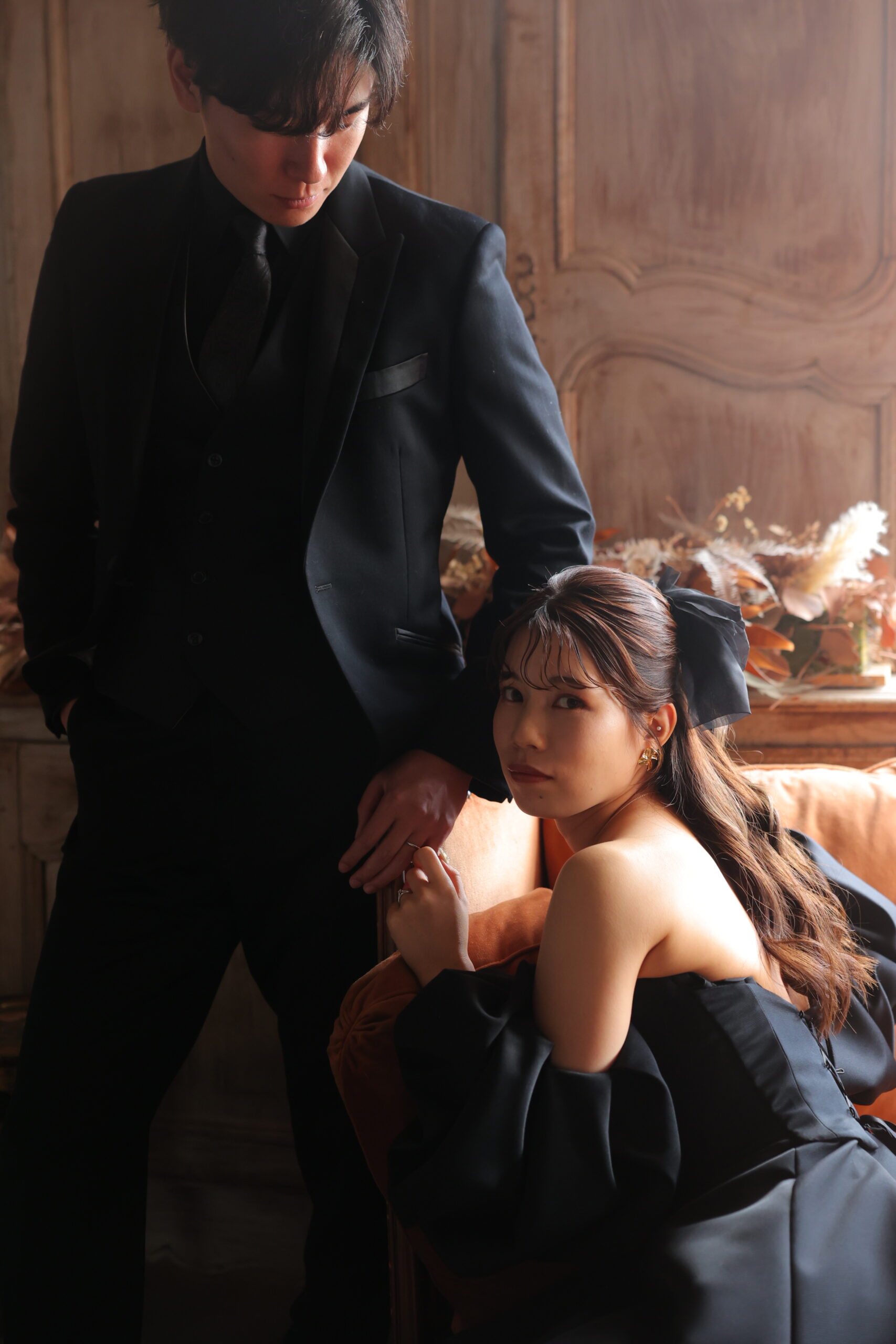 ブラックタキシードはフォーマル感と品格を備えつつ、シルエットや小物で印象を自在に変えられる万能な一着です。そこに新婦のブラックドレスを合わせると、クラシックな雰囲気からモード感のあるスタイルまで幅広く表現できます。例えば、レースやチュールをあしらった黒ドレスなら柔らかさや女性らしさが際立ち、タイトなシルエットやサテン生地の黒ドレスならモダンでシャープな印象に。