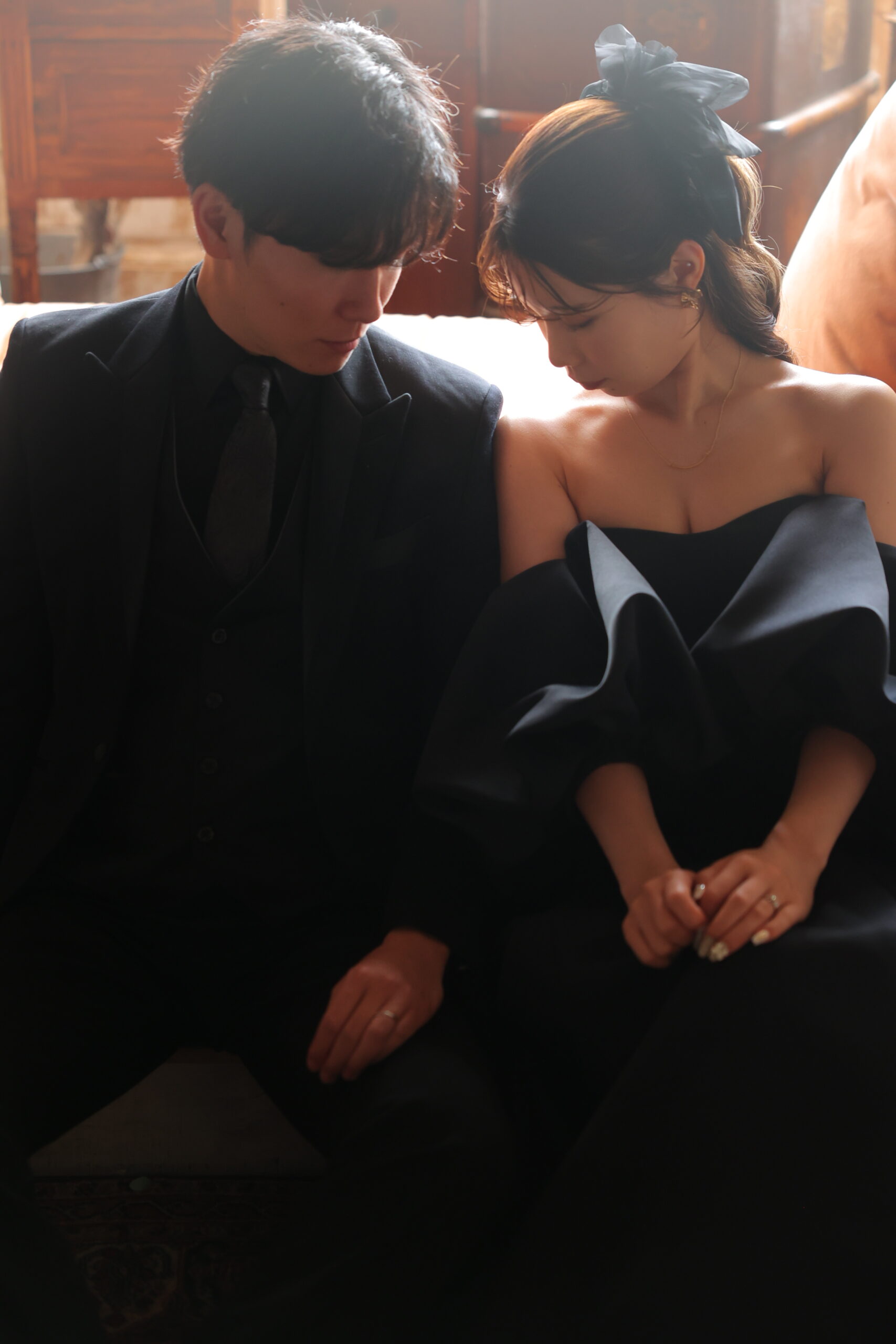 二人がブラックで揃えることで、会場装花や背景の色をより際立たせる効果もあります。白やゴールド、ボルドーなどのアクセントカラーを小物やブーケに取り入れると、写真に奥行きと華やかさが加わります。「花嫁は白」という固定観念を超えたブラックコーディネートは、モードで特別感のある一日を演出するスタイル。おふたりらしさを大切にしたい方、クラシックかつスタイリッシュにまとめたい方におすすめのコーディネートです