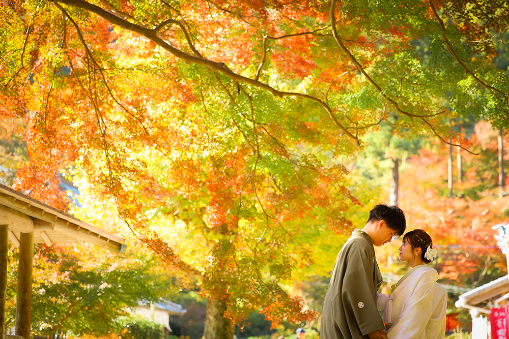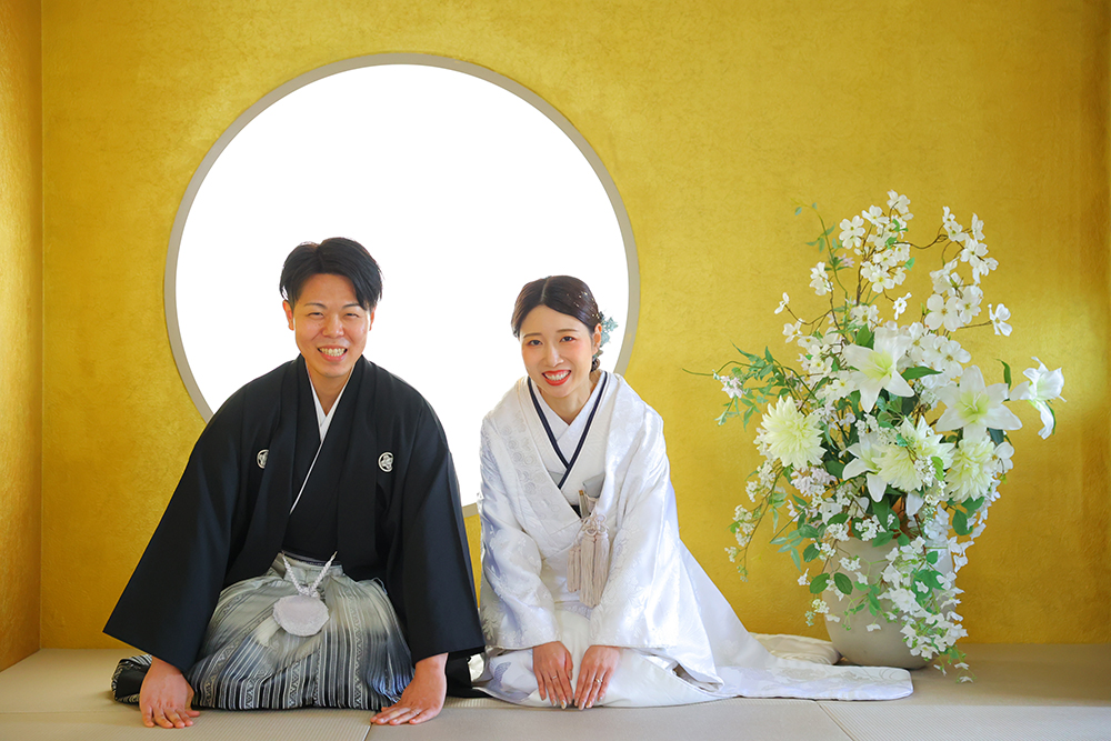 今は和装でもブーケを持って撮影をする方が増えてきているので和装でも可能。又は扇子でお口元を隠すようなスタイルでも古典的で素敵です。