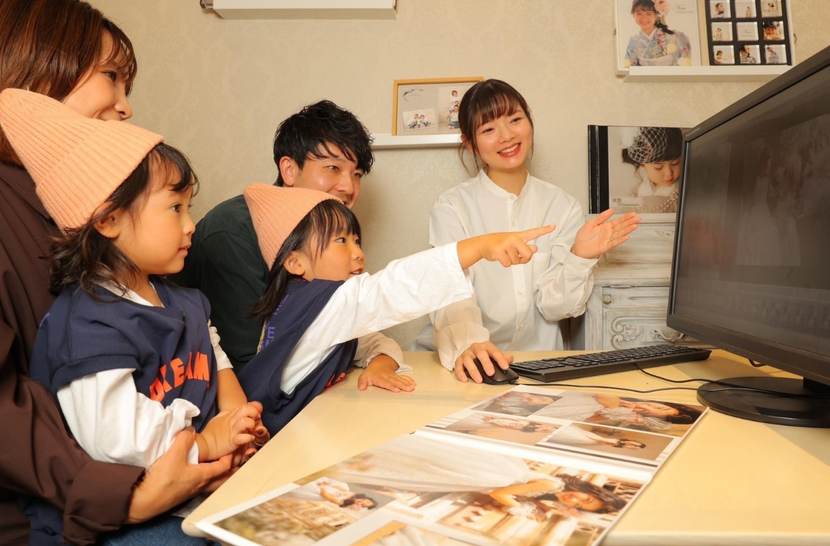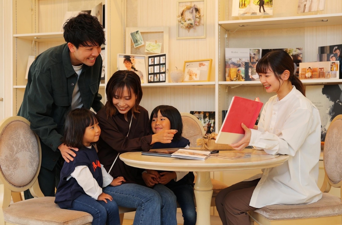 受付で伝票のご記入後、ご利用の際のお願いを一読の上、本日の撮影内容・ご要望をご確認いたします。「こんな写真を撮ってほしい」「こういうイメージがいい」など、お客様の想いをお話しください。