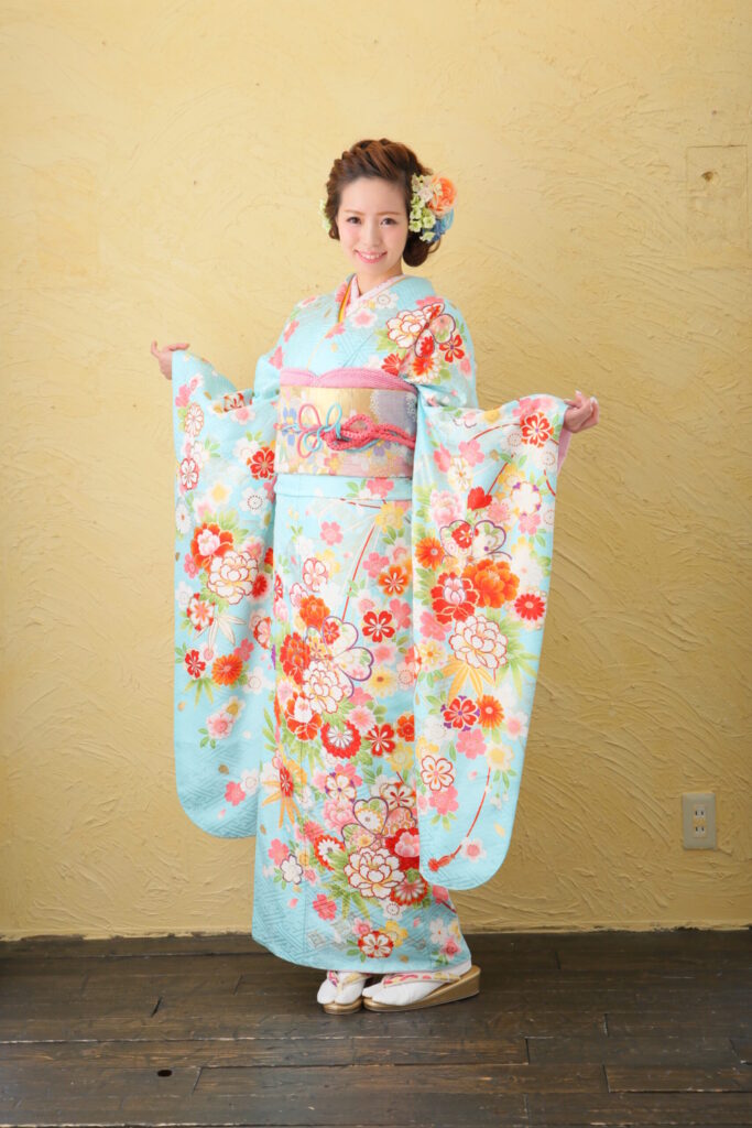 振袖、帯、重ね衿、帯締め、帯揚げ、長襦袢、肌襦袢、足袋、草履、バッグ、ショール、帯板、三重仮紐、腰紐、伊達締め、コーリンベルト、帯枕、衿芯