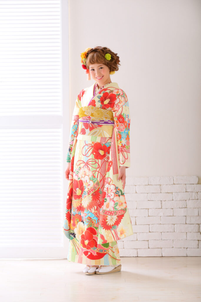 振袖、帯、重ね衿、帯締め、帯揚げ、長襦袢、肌襦袢、足袋、草履、バッグ、ショール、帯板、三重仮紐、腰紐、伊達締め、コーリンベルト、帯枕、衿芯