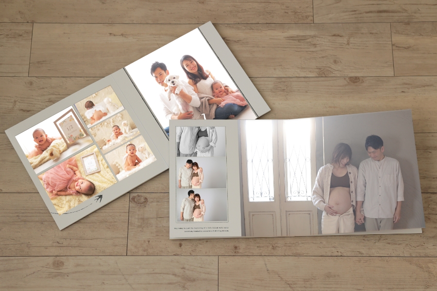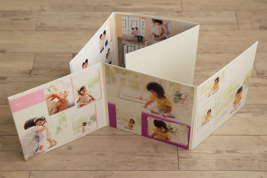 3 面台紙のデザインアルバム。表紙に2カット・中に10カット入り、見開きで一度に写真が見られる商品。