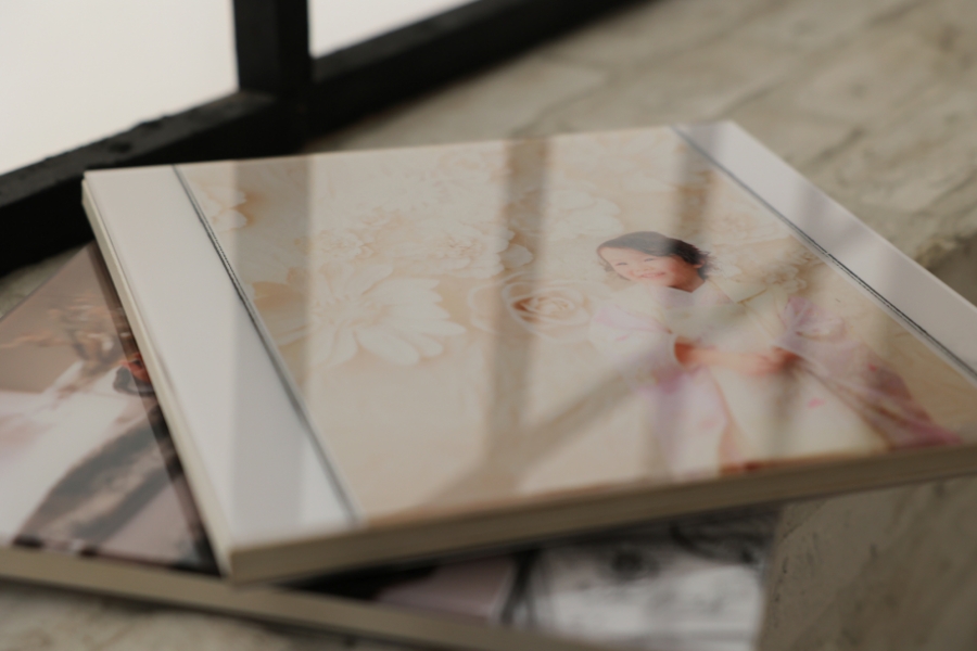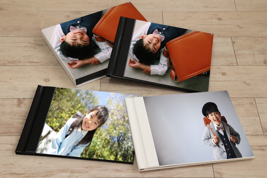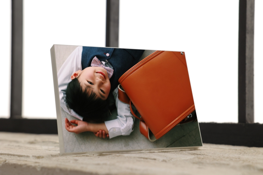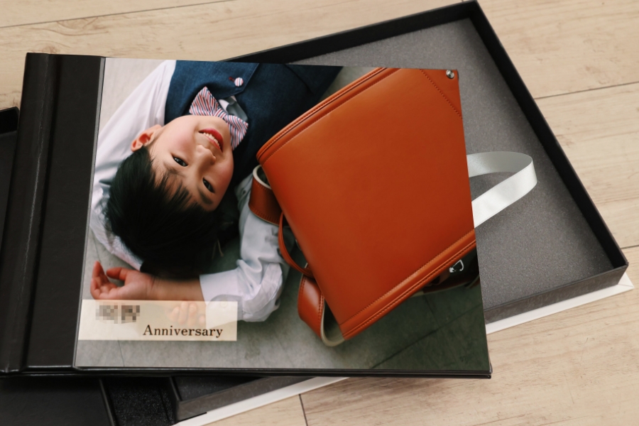 美しく高級感のあるアクリル加工の表紙も特徴。収納の箱にも写真が入ります。