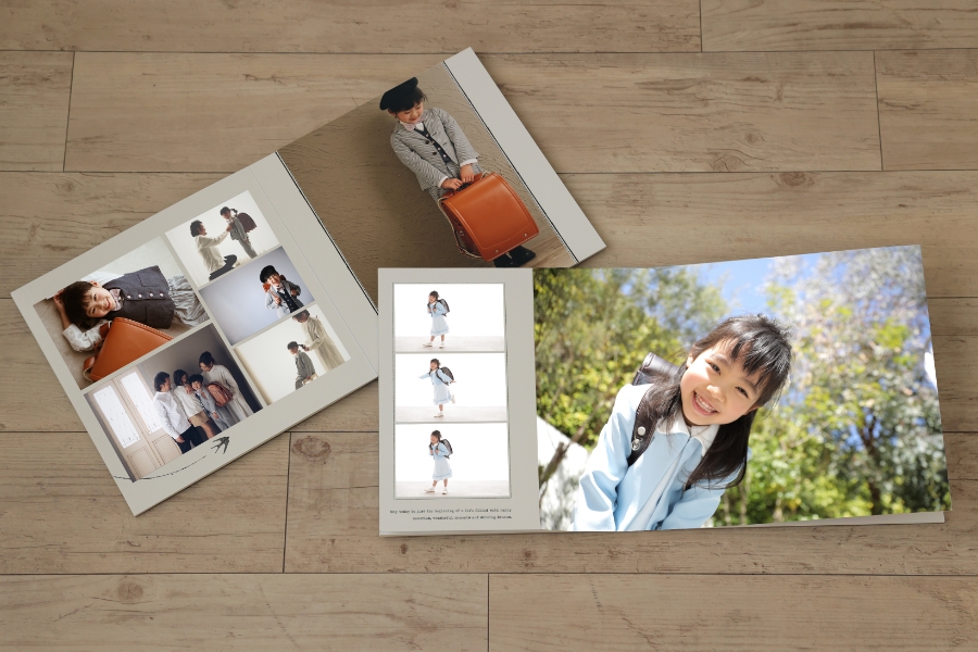 3 面台紙のデザインアルバム。表紙に2カット・中に10カット入り、見開きで一度に写真が見られる商品。