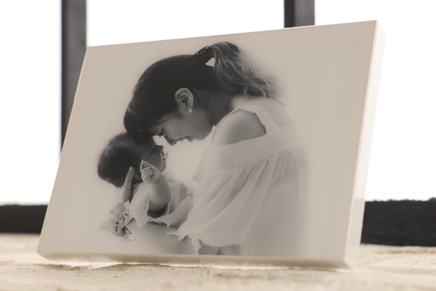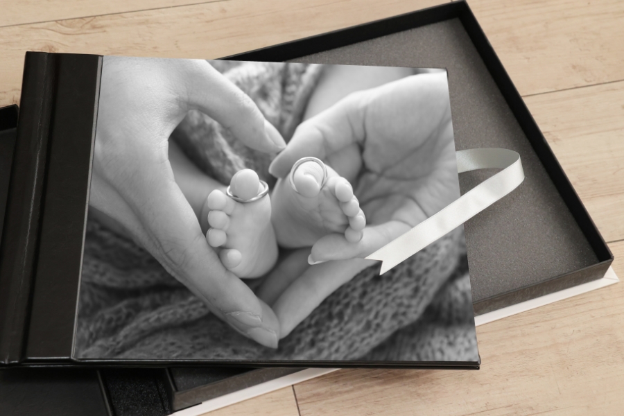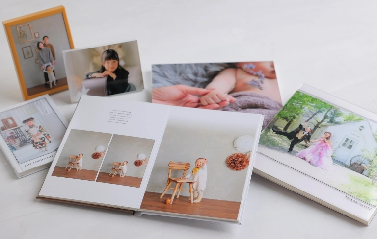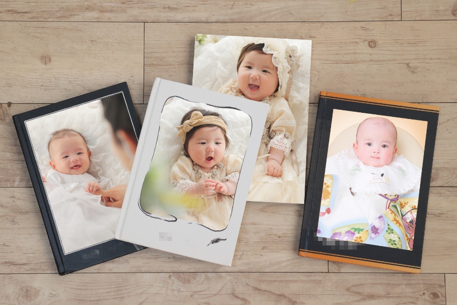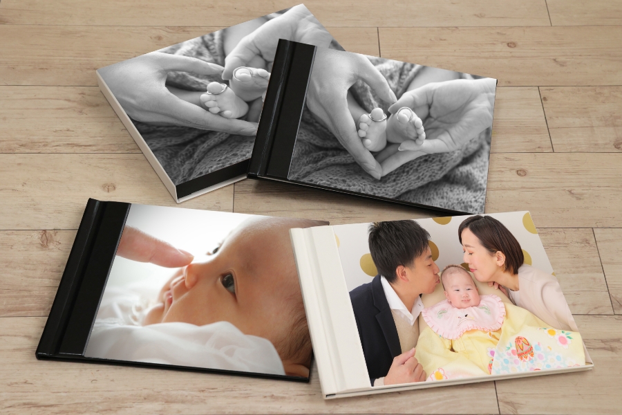 美しく高級感のあるアクリル加工の表紙も特徴。収納の箱にも写真が入ります。