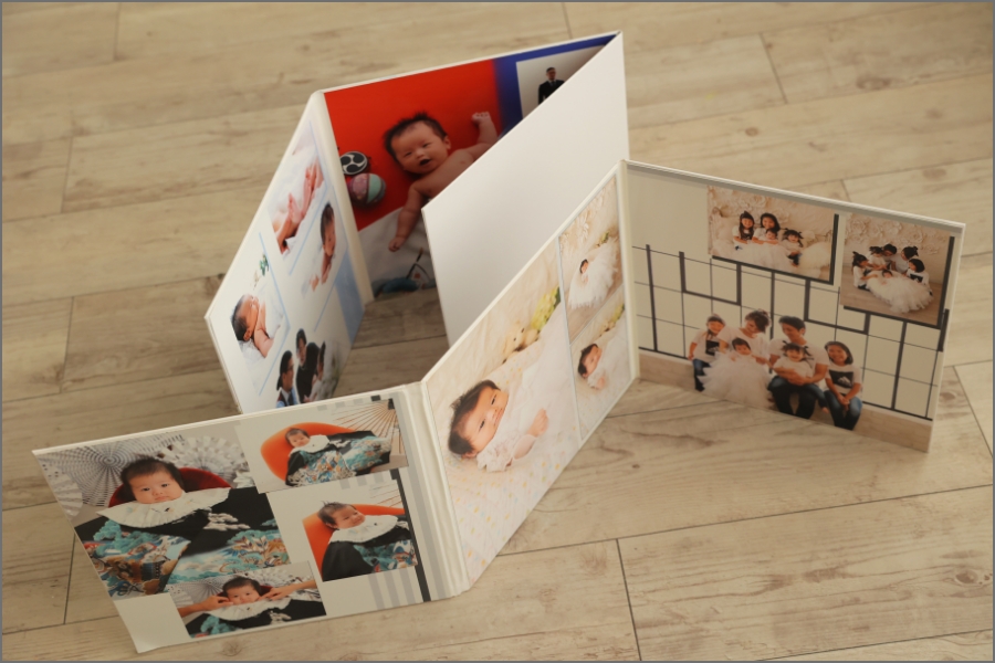 3 面台紙のデザインアルバム。表紙に2カット・中に10カット入り、見開きで一度に写真が見られる商品。