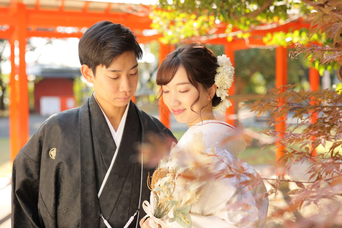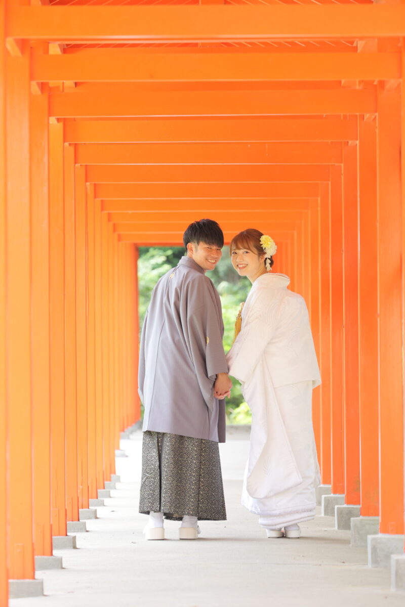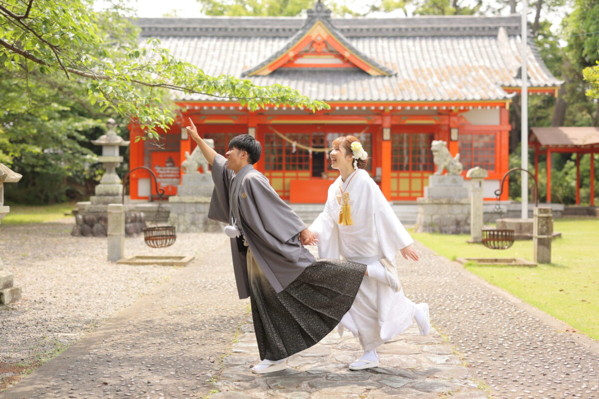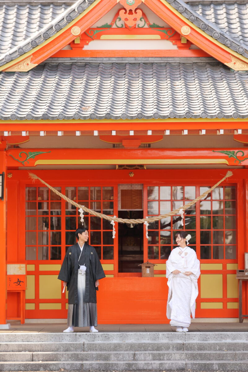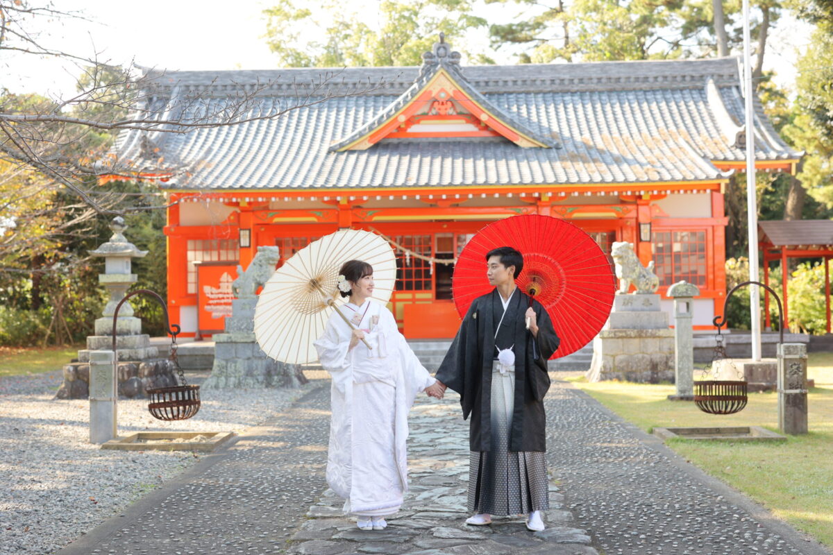 ホワイトベル浜松から20分の場所に位置し、真新しい朱色と深い緑のコントラストがとても美しい神社。特に幾つもの鳥居が連なったような意匠の参道は和装のお二人を囲む額縁のようで大変好評です。町中にひっそりと佇むスポットなので他の方にあまり見られたくない方にもおすすめです。小規模ですが桜と紅葉も楽しめます。