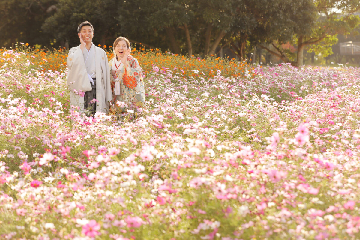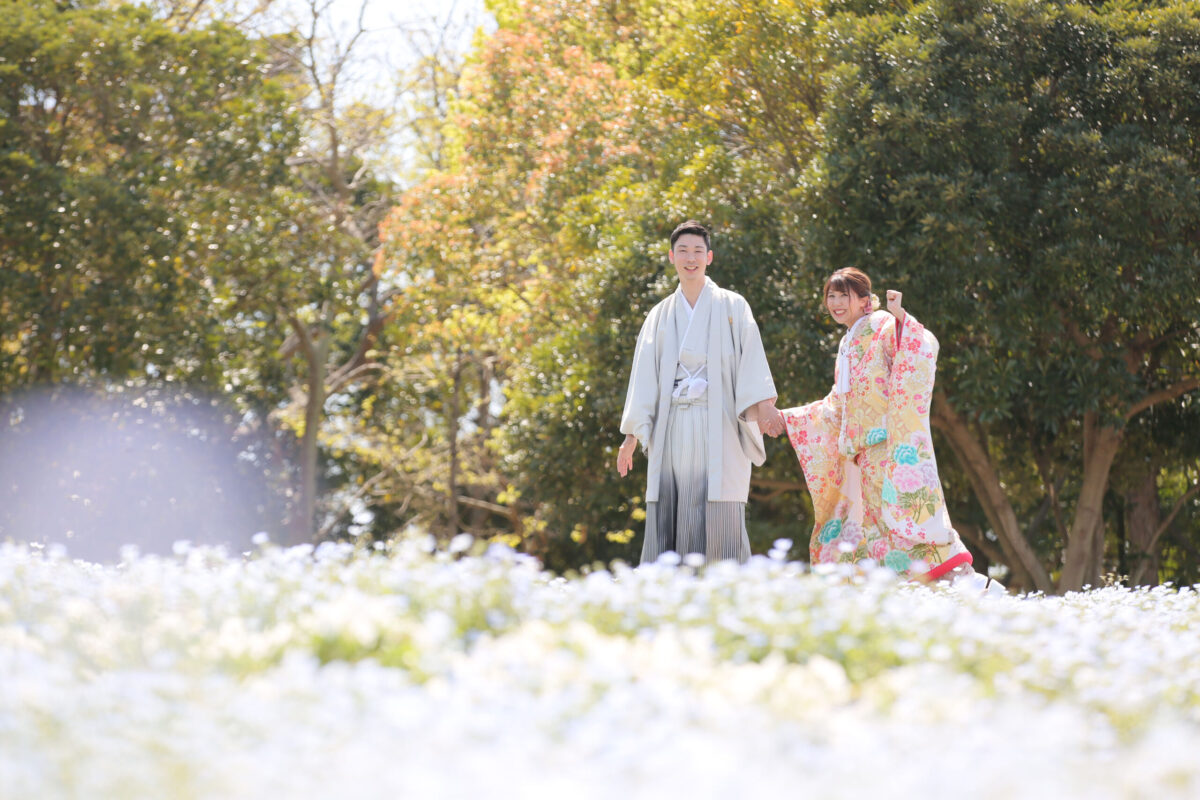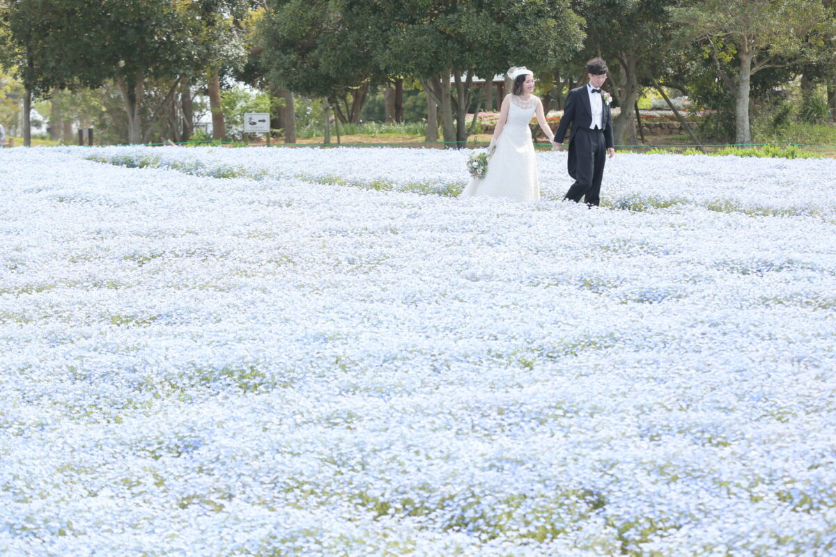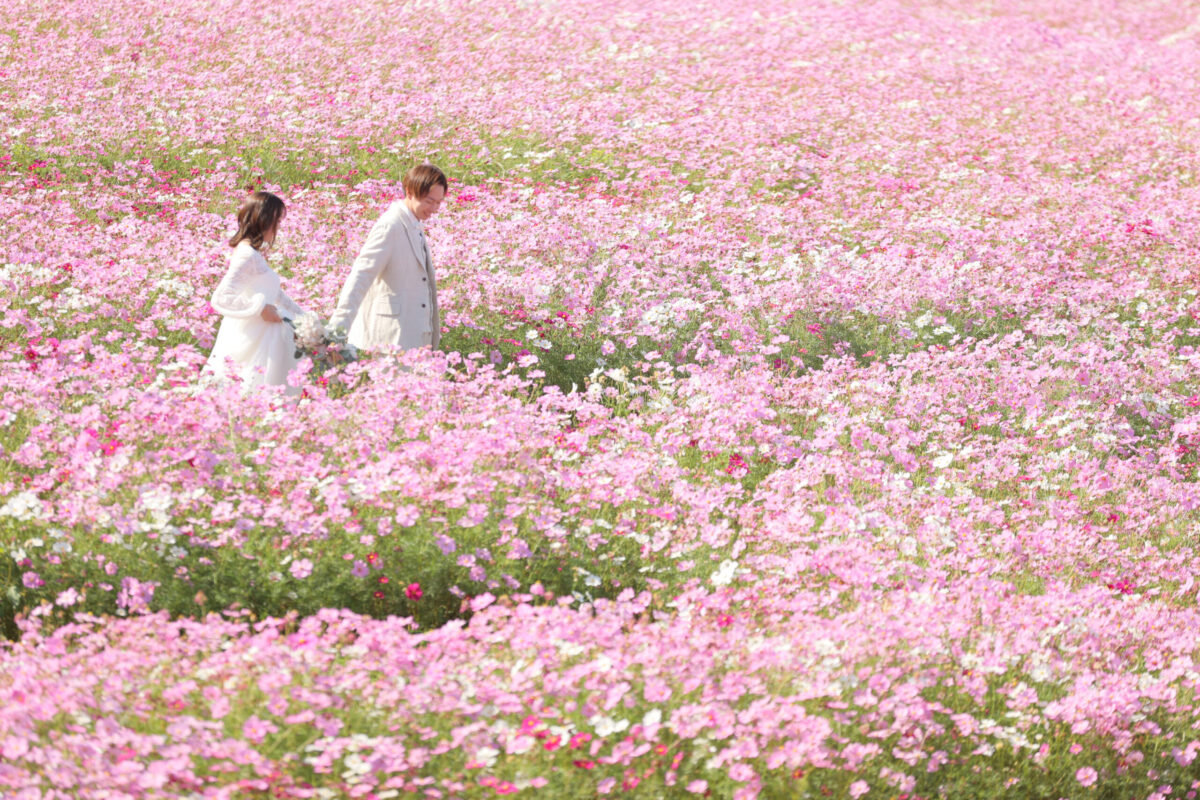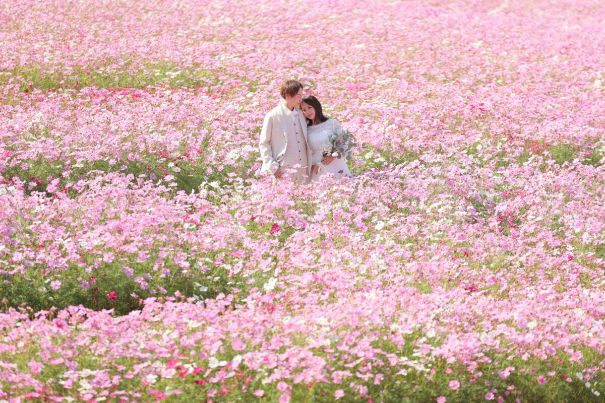 ホワイトベル浜松から20分の場所に位置する花と緑の公園。広場一面の春のネモフィラ、夏のひまわり、秋のコスモスが人気です。その他桜、バラ、紅葉など四季折々の花との撮影が楽しめます。敷地が広いので体力に自信のある方向けです。季節の見ごろの花は公式サイトでも確認できます。